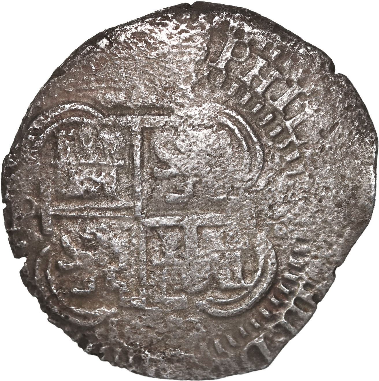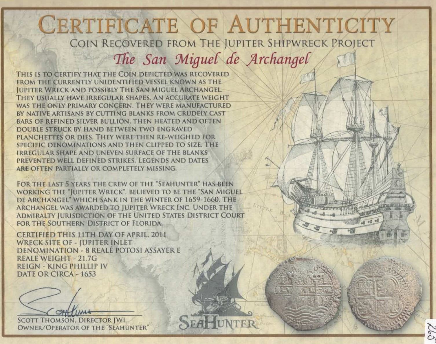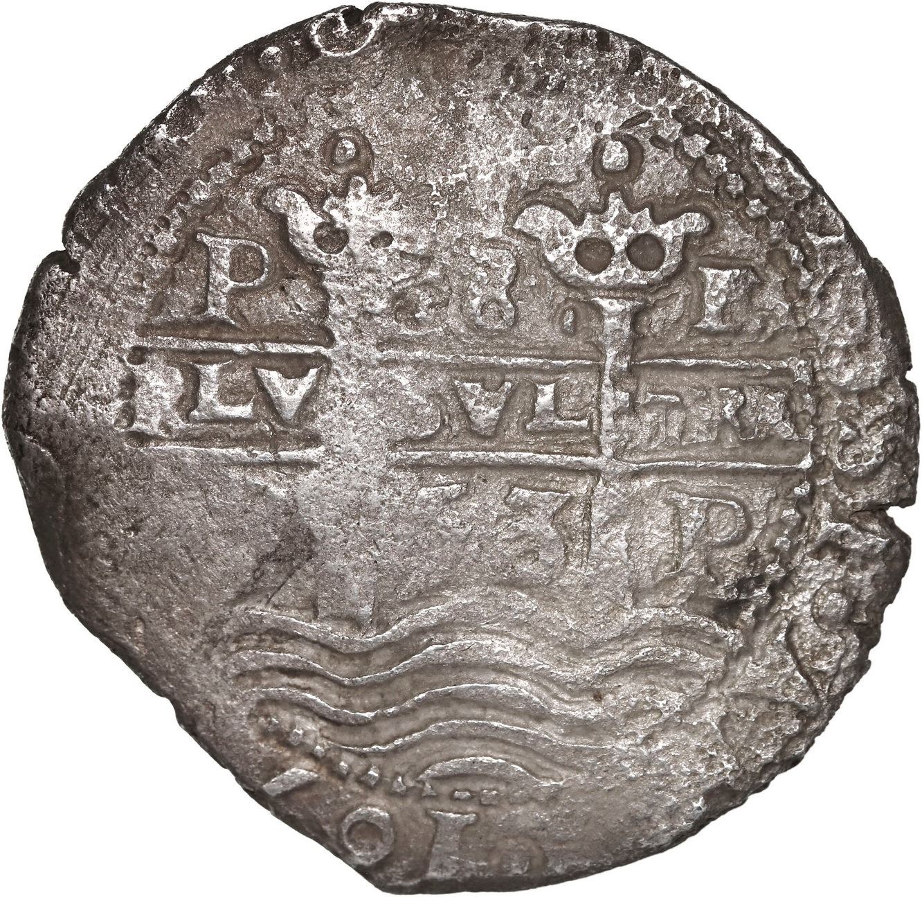 BOLIVIA, Potosí, cob 8 reales, 1653 E, •PH• at top, four-digit date below cross. S-P37a; KM-21; Cal-1504. 21.72 grams. Full pillars-and-waves with two dates on that side, partial third date below full but off-center cross-lions-castles, no toning (low contrast) and light to moderately corroded all over. With original photo-certificate from the salvor (Scott Thomson). Recovered from: “Jupiter Wreck” (San Miguel Arcángel), sunk in 1659 off the east coast of Florida