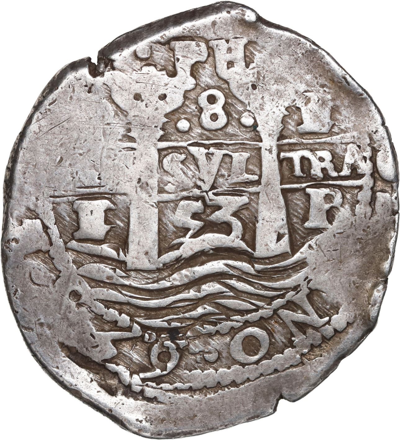 BOLIVIA, Potosí, cob 8 reales, 1653 E, •PH• at top. S-P37a; KM-21; Cal-1503. 26.98 grams. Slightly oval flan with bold full cross and (off-center) pillars-and-waves, three bold dates (653 below cross) and assayers, two mintmarks, VF with lovely toning, clear •PH(•) variety but flat at top of cross (could be 8 or pomegranate).
