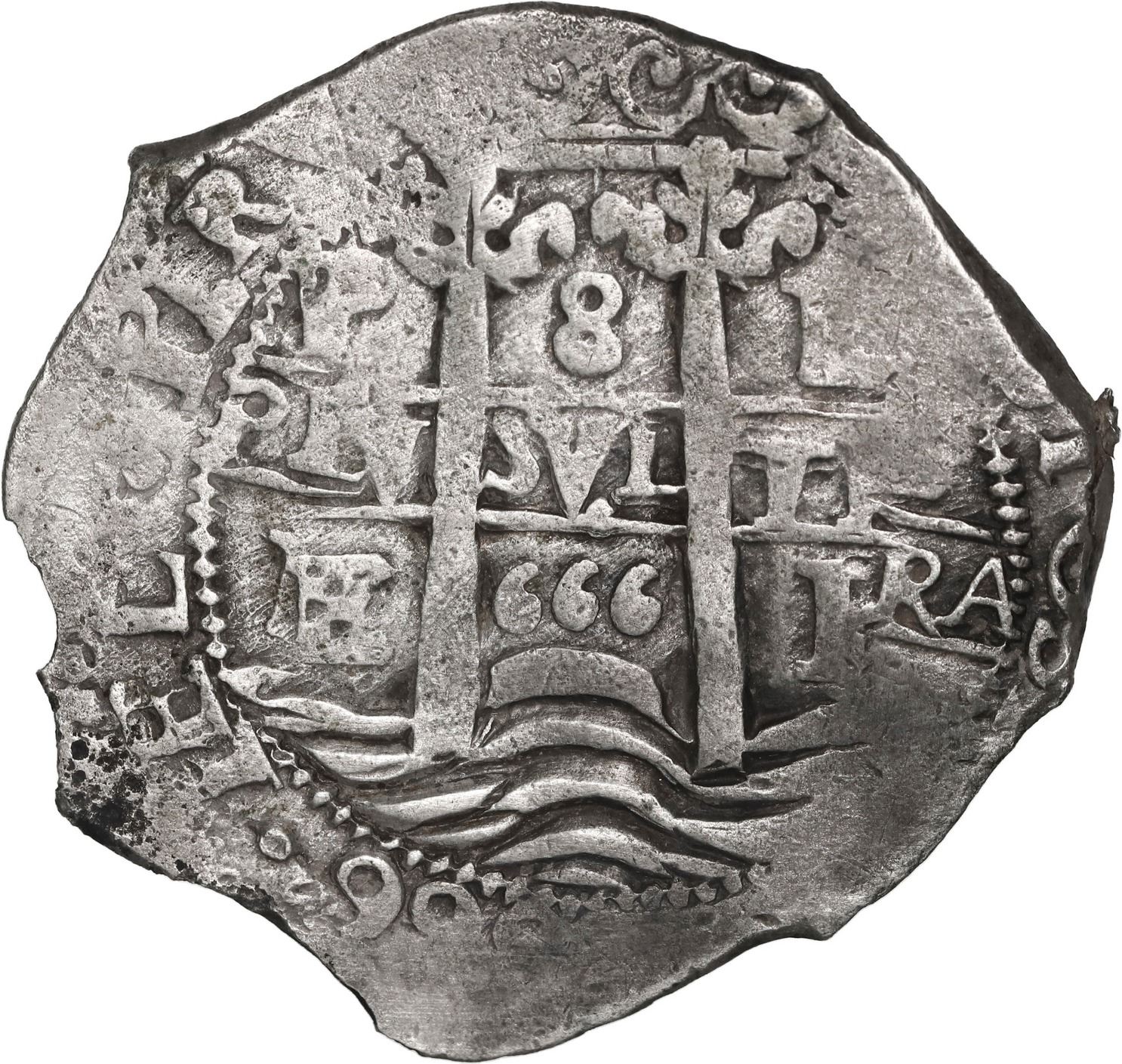 BOLIVIA, Potosí, cob 8 reales, 1666 E, date as "666" between pillars. S-P37a; KM-21; Cal-unl (Type 335). 26.95 grams. Scarce and ever-popular variety with full and clear "666" date contained in 100% full pillars-and-waves, same date below full cross and prominent 66 of third date in legend, all three mintmarks and assayers as well, VF+ details with light toning but area of heavy pitting to right of cross. With certificate.