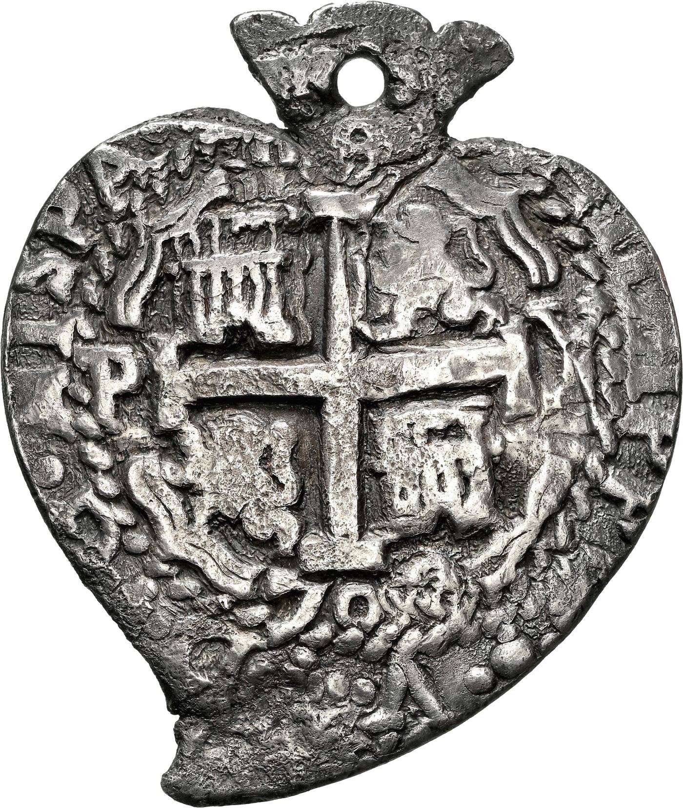 BOLIVIA, Potosí, cob 8 reales Heart, 1709 Y, NGC XF details / environmental damage, finest and only example in NGC census, ex-von Schuckmann. S-P43a; KM-unl; Cal-1525. 28.09 grams. As a type, the rarest and most highly sought pieces in Potosí cobs are Hearts, intentionally shaped at the mint and struck with Royal dies, presumably to be worn or otherwise displayed in a religious setting, as the flaming Sacred Heart of Jesus Christ was (and is) an important symbol in the Catholic Church. The first Hearts were struck in the late 1680s, then issued sporadically until the 1750s. The most desirable Hearts are the 8 reales, of which our records indicate only 41 examples exist across 17 dates, this being only the fifth we have offered, a die-match with Lázaro 324 (rated RU for unique, but not the same coin as this one, itself a die-match with the Royal issue per Lázaro 250), but with its "tail" pointing right instead of left relative to the pillars side, all deeply toned and boldly struck with just a few spots of surface oxidation, minimal doubling and no flatness, and (best of all) medal-aligned with its scalloped-edge stem, holed as usual, to make for a perfect pendant, as no doubt it was in its time. Pedigreed to the Siegfried von Schuckmann Collection (Renaissance auction of December 2000, lot 678).