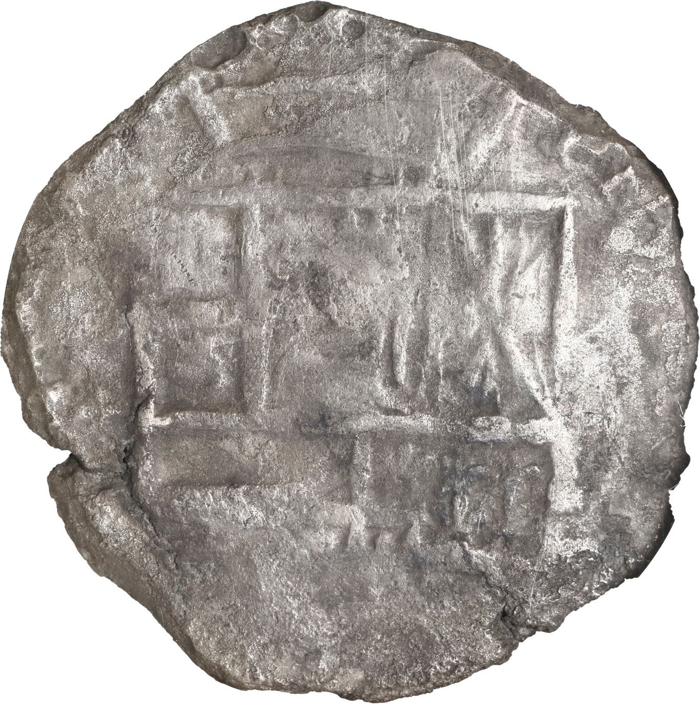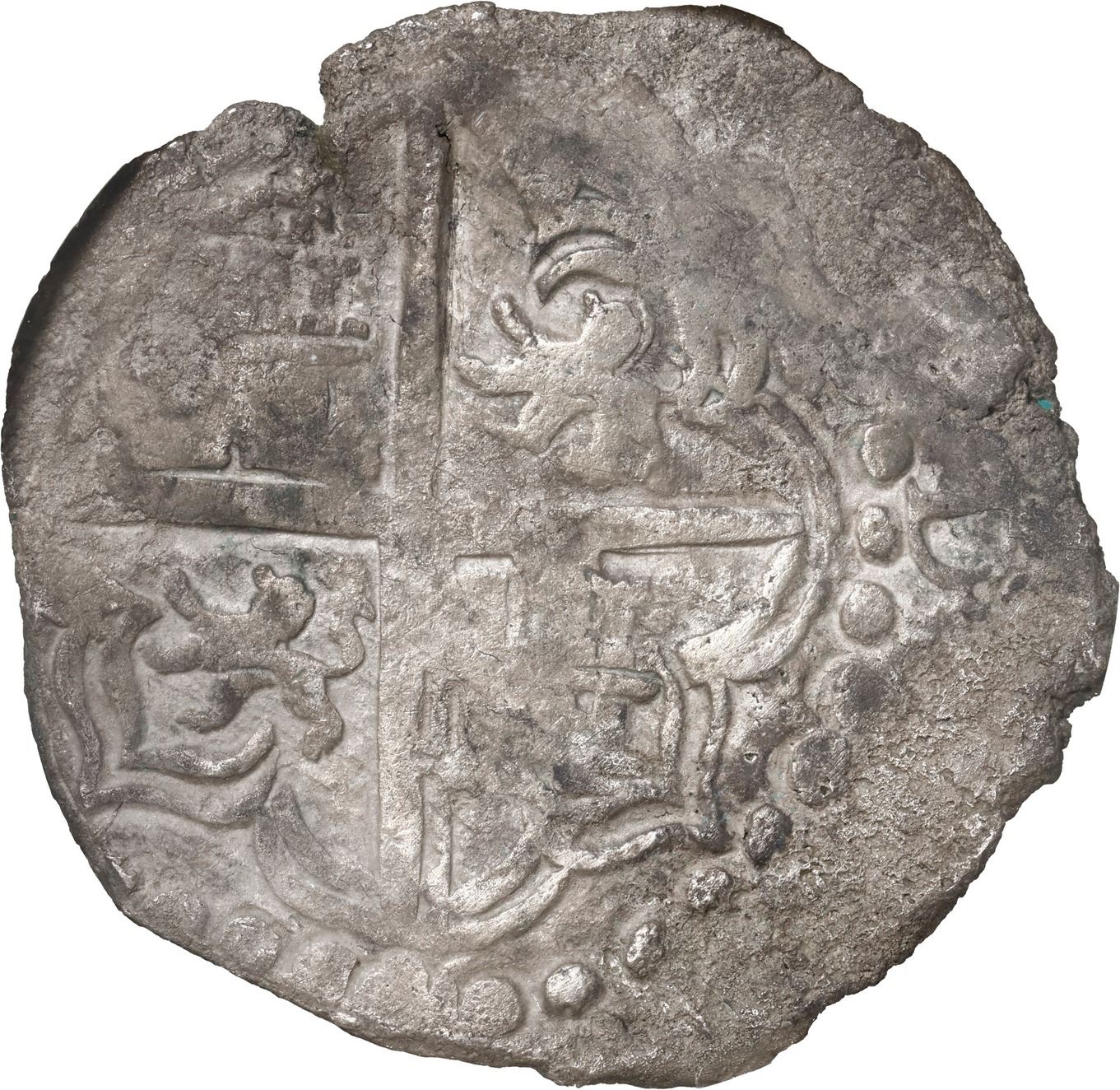 BOLIVIA, Potosí, cob 8 reales, Philip III, assayer not visible, Grade 2, NGC Shipwreck Effect (São José Shipwreck Label). KM-10; Cal-Type 164. Solid, dark gray-toned piece with bold, nearly complete shield and cross, mintmark visible (also probably assayer T), better quality than usually seen from this wreck. Recovered from: São José, sunk in 1622 off Mozambique, east of Africa
