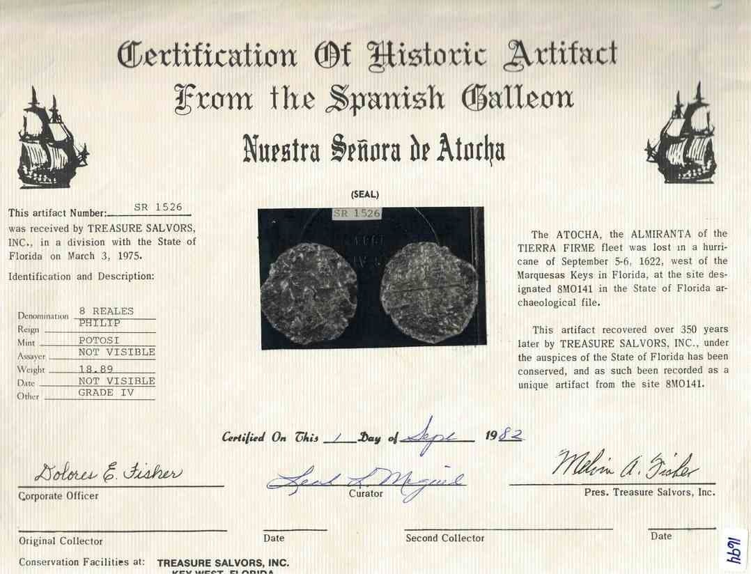 BOLIVIA, Potosí, cob 8 reales, Philip III, assayer not visible, Grade 4. KM-10; Cal-Type 164. 18.92 grams. Pitted shield side but with full cross, desirable as a State Release piece (indicated by the SR on the certificate). With original Fisher tag and photo-certificate SR 1526. Recovered from: Atocha, sunk in 1622 west of Key West, Florida