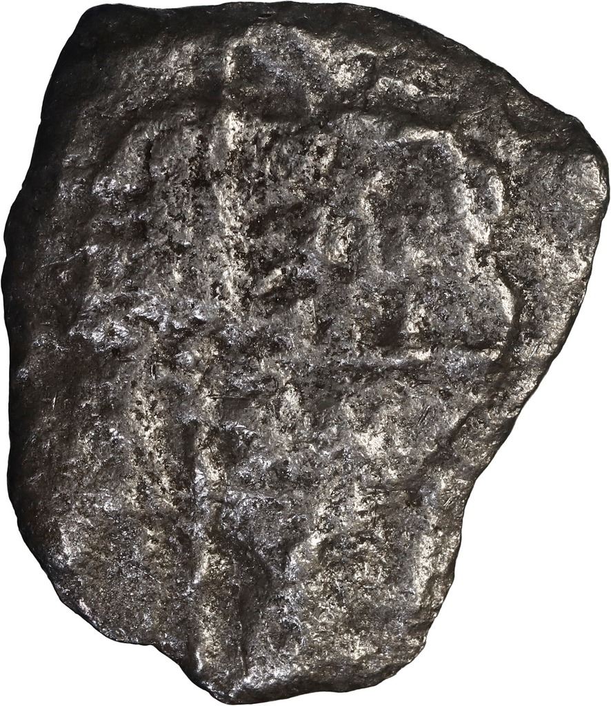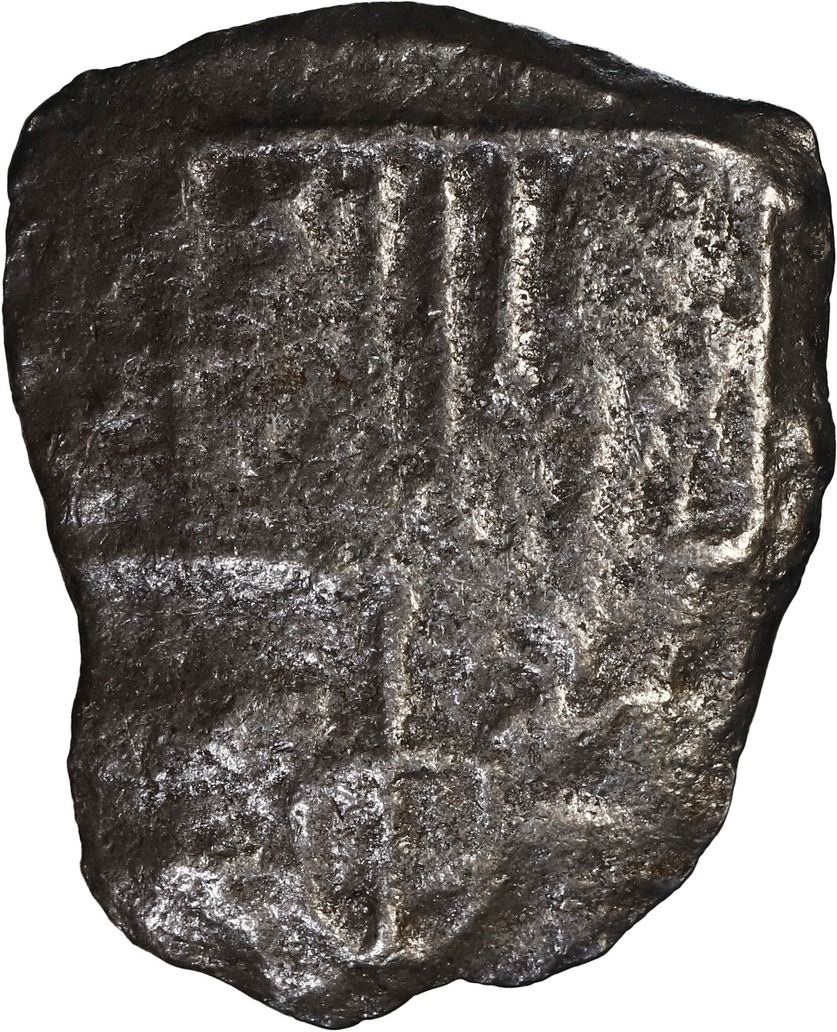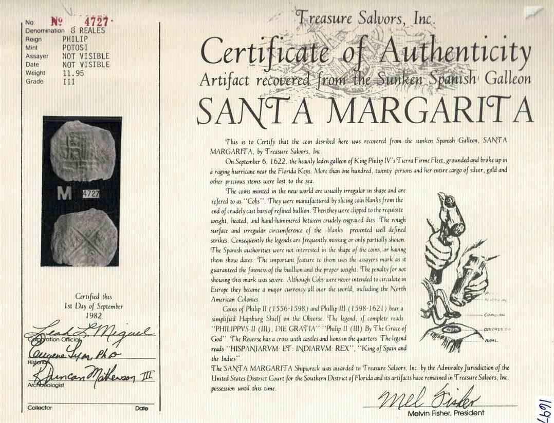 BOLIVIA, Potosí, cob 8 reales, Philip III, assayer not visible, Grade 4. KM-10; Cal-Type 164. 6.91 grams. Thin along the edges from corrosion but with some shield and cross detail, dark gray toning, mislabeled as a 4 reales on the tag and the certificate. With original Fisher tag and photo-certificate 11,292. Recovered from: Santa Margarita, sunk in 1622 west of Key West, Florida