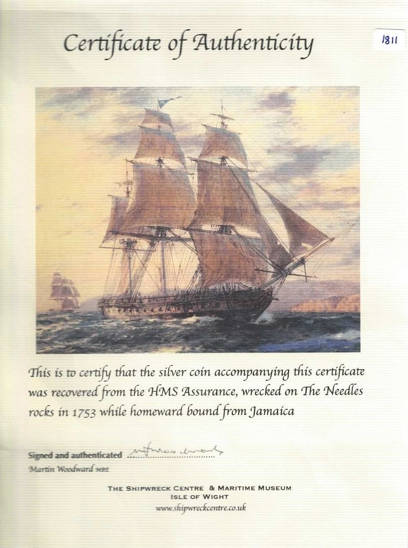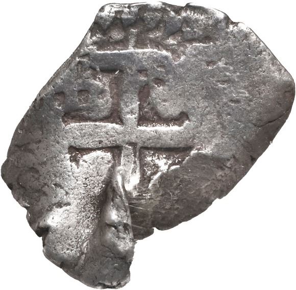 BOLIVIA, Potosí, cob ½ real, 1745, NGC F details / bent (Shipwreck Blue Label). S-P50; KM-27a; Cal-321. 2.14 grams. Rather thick and overweight piece with edge damage and bend, partial monogram with date just visible below, decent cross, scarce provenance. With original certificate from the salvor. Recovered from: HMS Assurance, sunk in 1753 off Isle of Wight, south of England