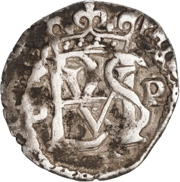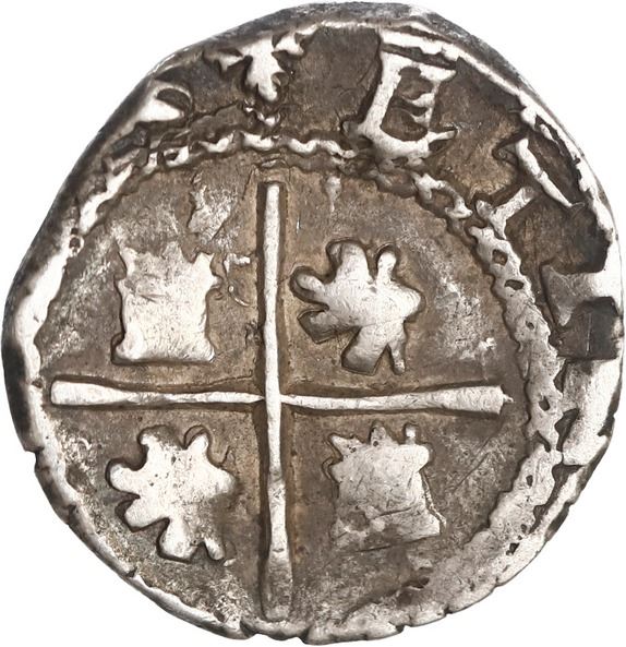 BOLIVIA, Potosí, cob ½ real, Philip II, assayer B (5th period, borders of x's). S-P14; KM-1.4; Cal-unl. 1.51 grams. Nice VF with bold full monogram and clear assayer, complete cross with part of legend showing, dark gray contrasting toning in the fields.