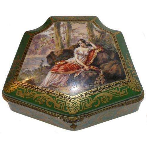 This large, antique porcelain dresser box features a hand-painted female portrait signed "Bollinger", and likely was made in Limoges France. Remants of an old paper label resides on the underside, but we have found no hallmarks. It measures 8.5" wide, 7" deep and 4" high. It weighs 2 lbs. 14 oz. (1.3 kg). Condition is excellent, with no visible cracks or chips or repairs. There is some adhesive label residue on the right side of the top which can be removed prior to shipment. This item resides with our client on the Upper East Side of Manhattan in New York and may be seen by appointment.