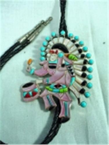 BOLO TIE WITH STERLING SILVER DECORATIVE TIPS AND A FULL BODY MORNING KACHINA COMPLETELY INLAID WITH TURQUOISE, MOTHER OF PEARL, ONYX, CORAL, AND MORE. 4" X 3".