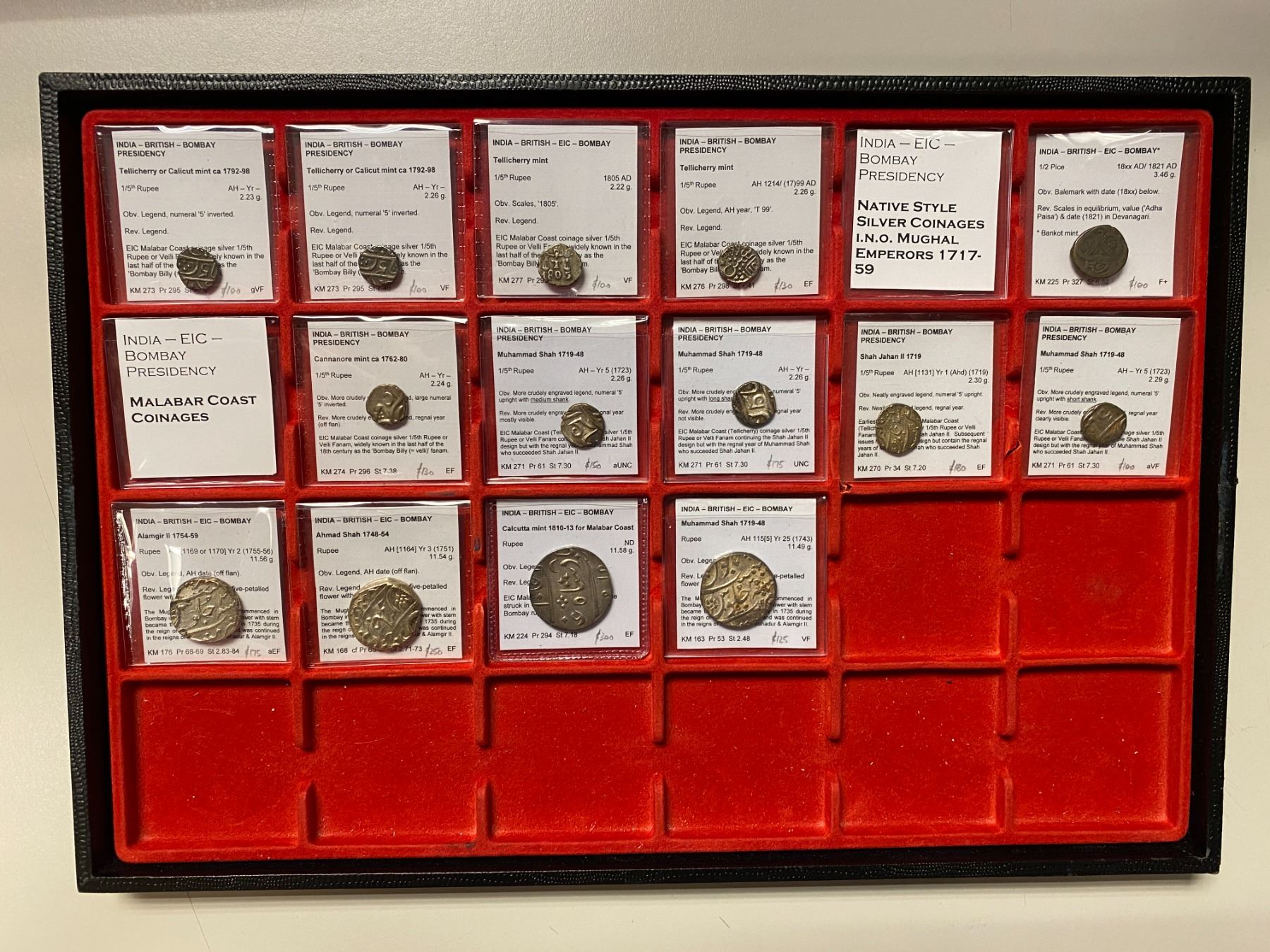 BOMBAY PRESIDENCY: MALABAR & related: LOT of 13 silver and 1 copper coin, Silver: Munbai mint: Rupees: Stv-2:48, AH115(5) year 25 (1 pc), Stv-2.83/84 year 2 (1), Sty-2.71/73 (1), and Stv-7.18 ND (1, struck at Calcutta); average VF to EF); and 1/5 Rupees: Stv-7.20 year 1 (1), and Stv-7.30 (3); Cannanore mint: 1/5 rupee: Stv-7.38, ND (1), average VF-EF; and Tellicherry mint: Stv-7.40 ND (2), Stv-7:41, 1799 (1), and Stv-7.42 1805 (1), all VF; and Copper: Bankot mint: 1/2 pice: Stv-6.52 1821 (visible only one side) (Fine); all with Ian Todd's description; retail value $650, lot of 14 pieces.