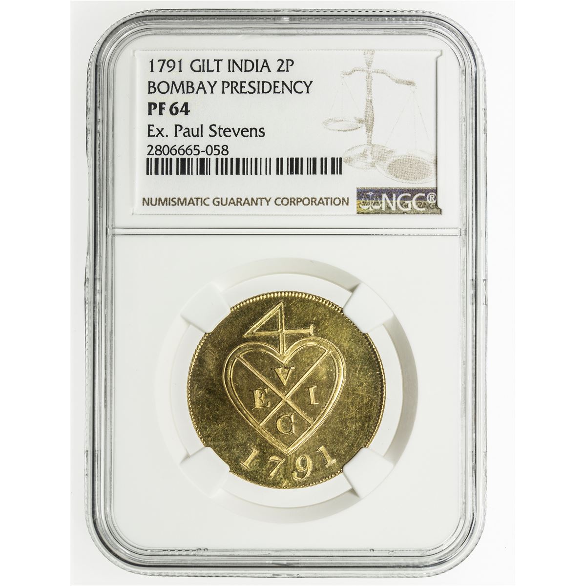 BOMBAY PRESIDENCY: gilt AE 2 pice, [Soho mint], 1791, Stv-8.5, Prid-120. KM-196a, type A/1 (dot below V / medium length pivot), NGC graded Proof 64.
