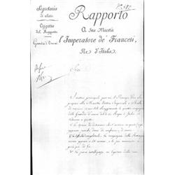 (1769 - 1821) The "Little Corporal" whose brilliance in the field of battle and as Emperor of France has made him perhaps the most important figure of post-Renaissance Europe. L.S. "Accorde Napole" 2pp. tall folio, Parigi, July 26, 1806, a lengthy report In Italian from the Secretary of State of the Kingdom of Italy. Untranslated, apparently good content regarding military matters. Boldly approved by Napoleon at left margin and near fine condition.