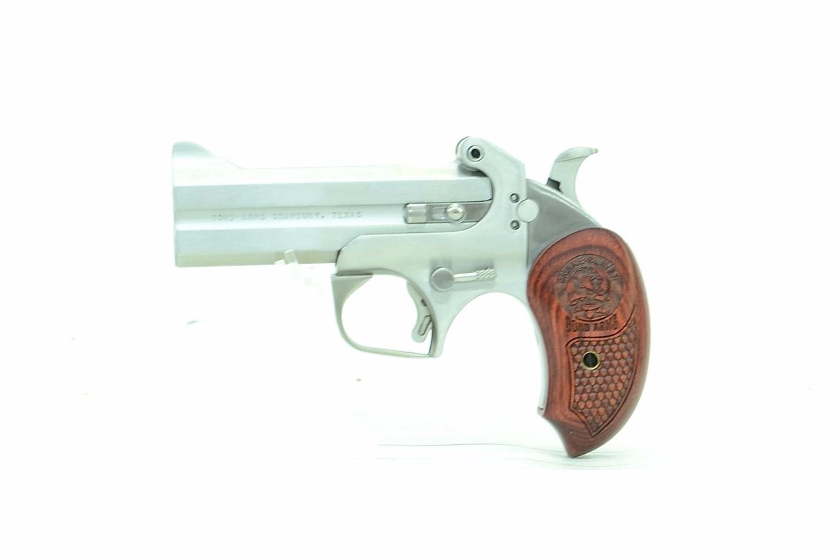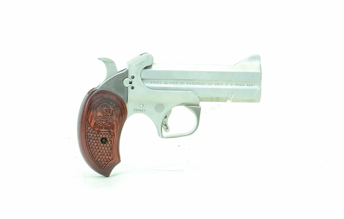 STOCK 2269HR-0538-G1,BOND ARMS, MODEL SNAKE SLAYER IV, CAL 45 LC/410GA X 3” ACTION: OVER/UNDER, BARREL LENGTH: 4.25”, BRUSHED STAINLESS, BROWN LAMINATE GRIP, EXTERNAL HAMMER, EXTRACTOR, FIXED SIGHTS, CROSS BOLT, SAFETY, DERRINGER STYLE CONCEPT. CONDITION: NEW IN BOX. SN: 116XXX