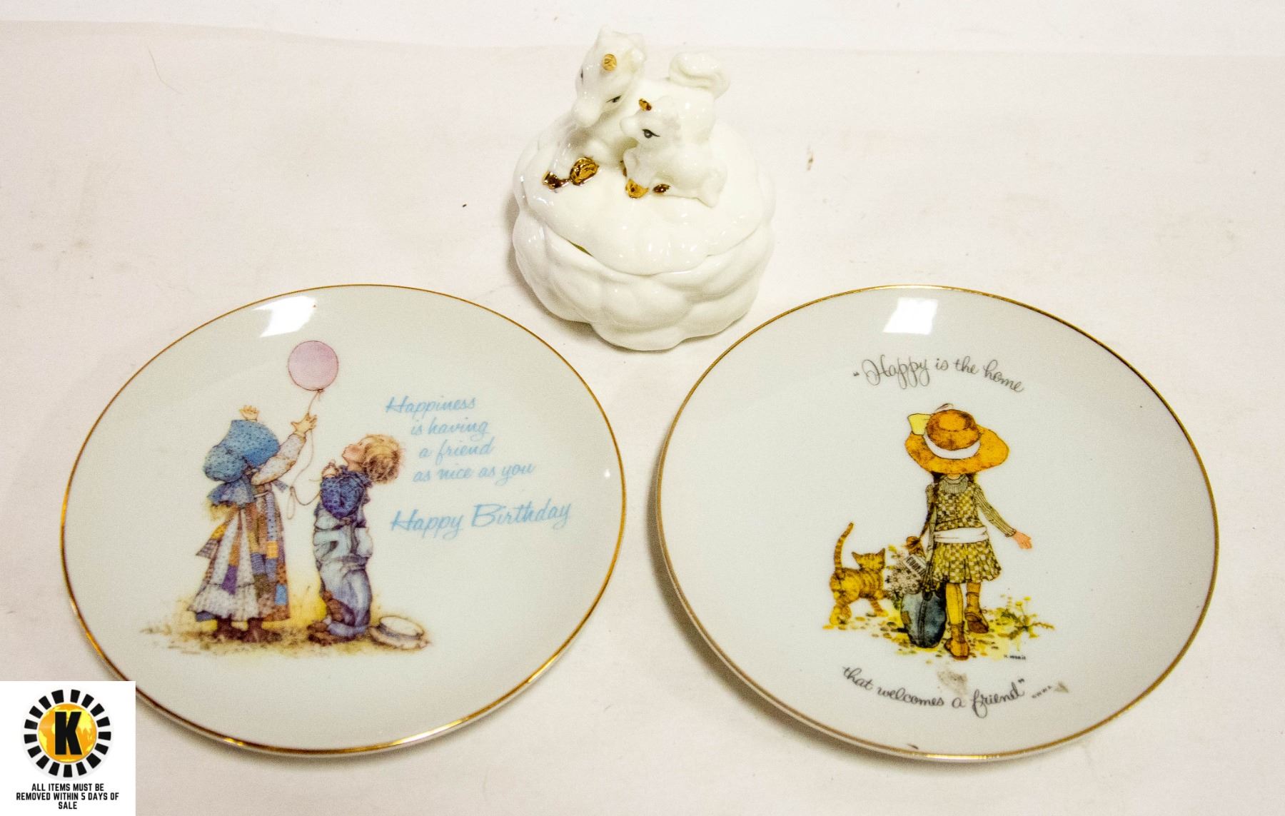BOX WITH 18KT. GOLD PLATED & 2 HOLLY HOBBY PLATES **ALL ITEMS MUST BE REMOVED BY 5PM SATURDAY, NOVEMBER 4TH 2023. ALL REMAINING ITEMS WILL BE SUBJECT TO A $6.00 PER DAY STORAGE CHARGE. ANY ITEMS REMAINING AFTER MONDAY, NOVEMBER 18TH, 2023 WILL BE CONSIDERED FORFEITED. NO REFUNDS WILL BE ISSUED FOR FORFEITED ITEMS. TO SCHEDULE A PICK UP APPOINTMENT CLICK HERE