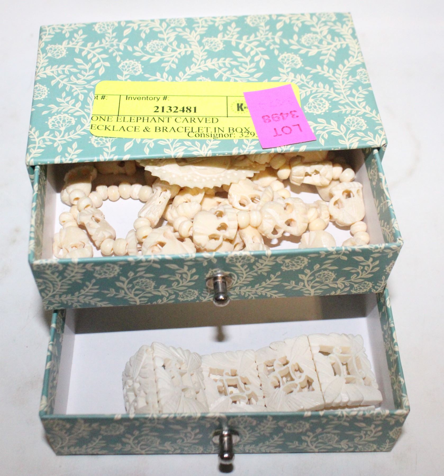 BONE ELEPHANT CARVED NECKLACE & BRACELET IN BOX