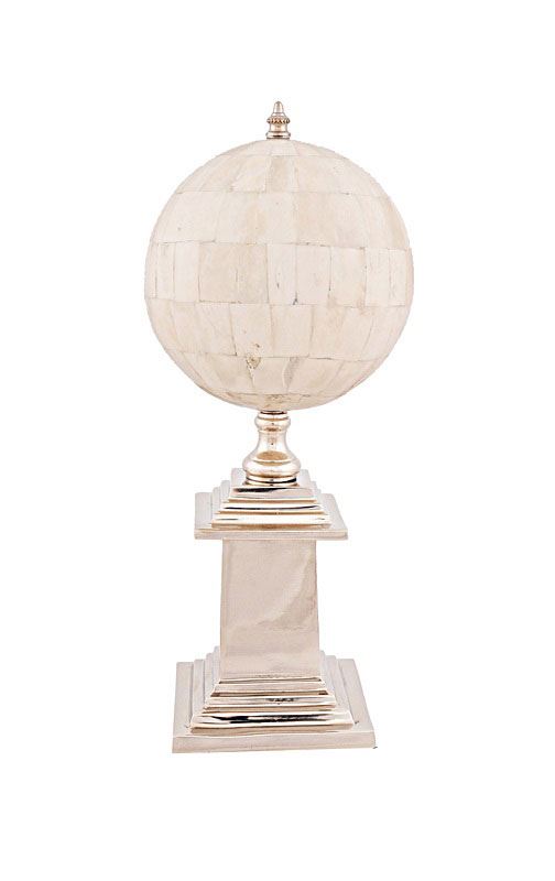 BONE GLOBE W/ALUMINUM BASE **|**|** One-of-a-kind amaro bone pleated globe. This classy globe has a silver base and will be the center of attention among other home décor pieces. • Globe made out of buffalo bone • Base made out of aluminum with shiny nickel finish