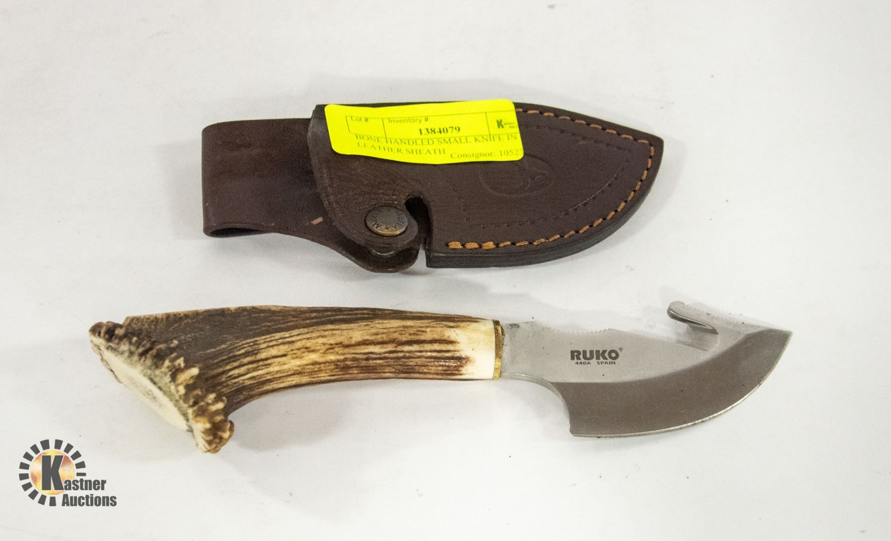 BONE HANDLED SMALL RUKO KNIFE IN LEATHER SHEATH