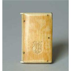 Lot 577 BONE MATCH SAFE. Very interesting bone match safe has a flip lid on each end. Inset on one side with what appears to be a stone striker, which is well used. Front is lightly engraved with a floral design surrounding a deeply carved monogram "T B" within a shield. A piece of paper inside has handwritten note stating "Prince of Wales Match Safe Bone". Bone has rich brown age patina. SIZE: 2-1/4" x 1-1/2". CONDITION: Very good to excellent. 5-69300 (200-400)