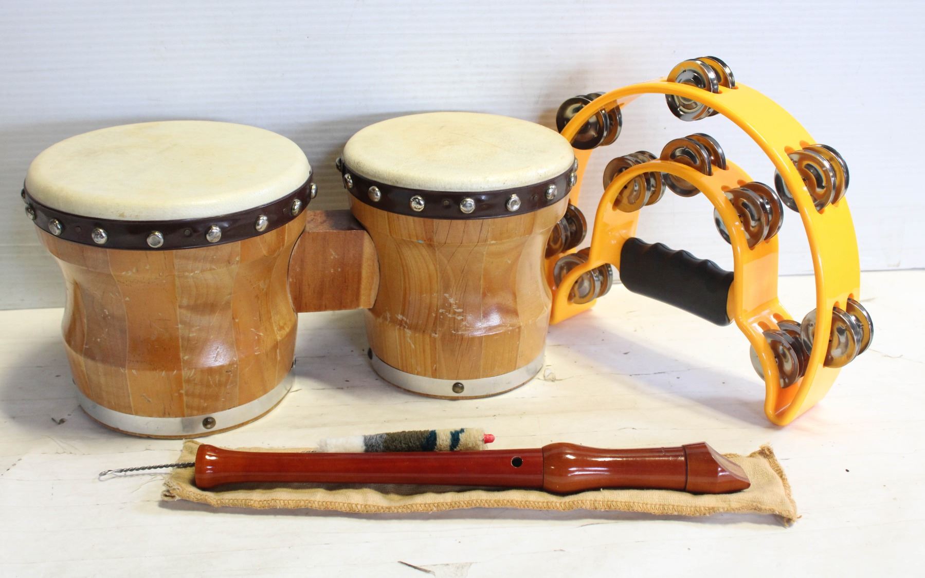 BONGOS, TAMBOURINE + GERMAN WOODEN RECORDER