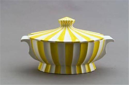Josef Emanuel Margold<BR> Terrine,<BR> Keramik. Heller Scherben streifig gelb bemalt, glasiert. Ovale Form, außen kanneliert. Handhaben äu min. best. H.: 20 cm, L.: 36 cm. Bez.: Firmenmarke, Künstlerstempel ENTWURF MARGOLD DARMSTADT EM, (Entwurf für die Manufaktur, der wohl nicht in Serie ging.) Mod.Nr. 1644 9. Um 1909.<BR>