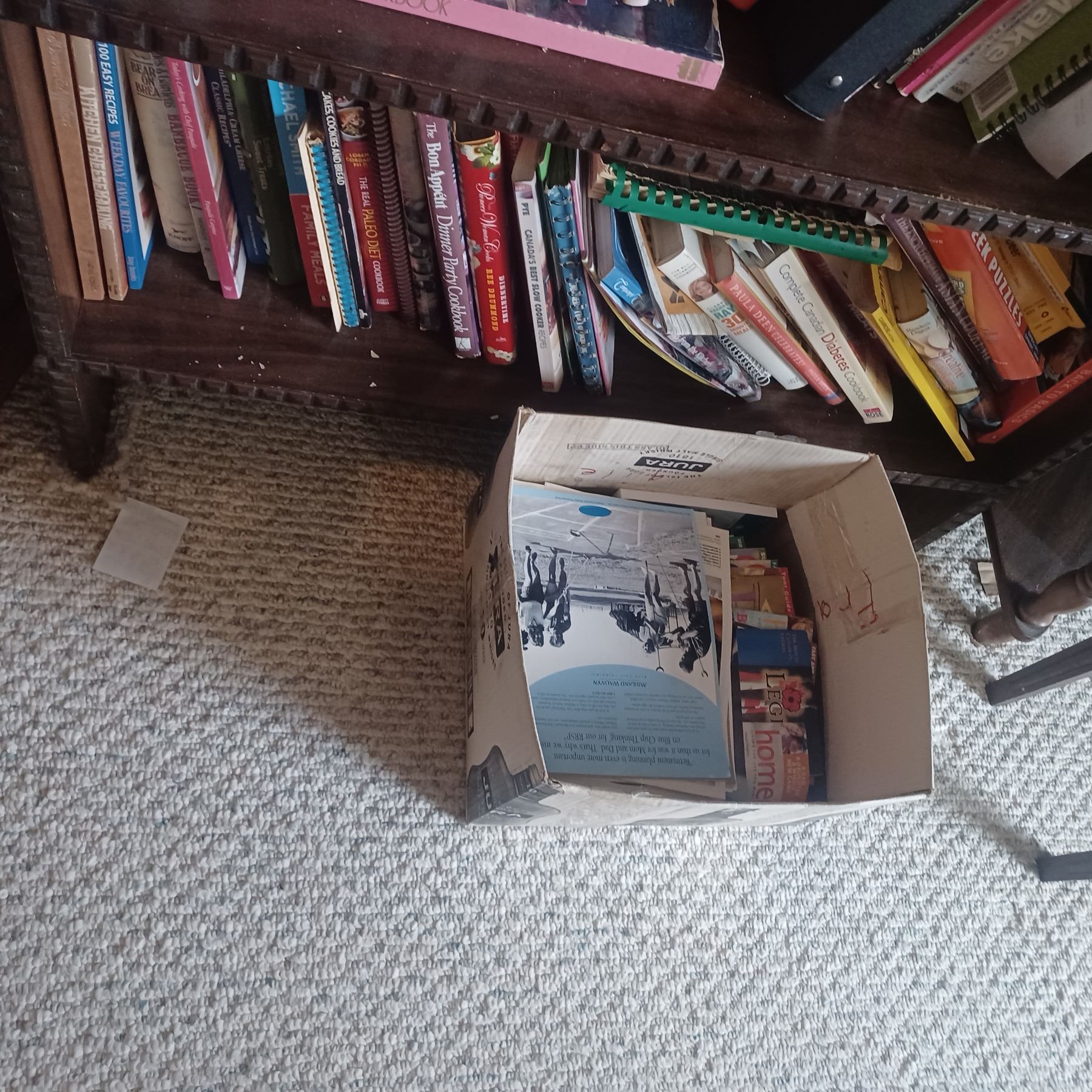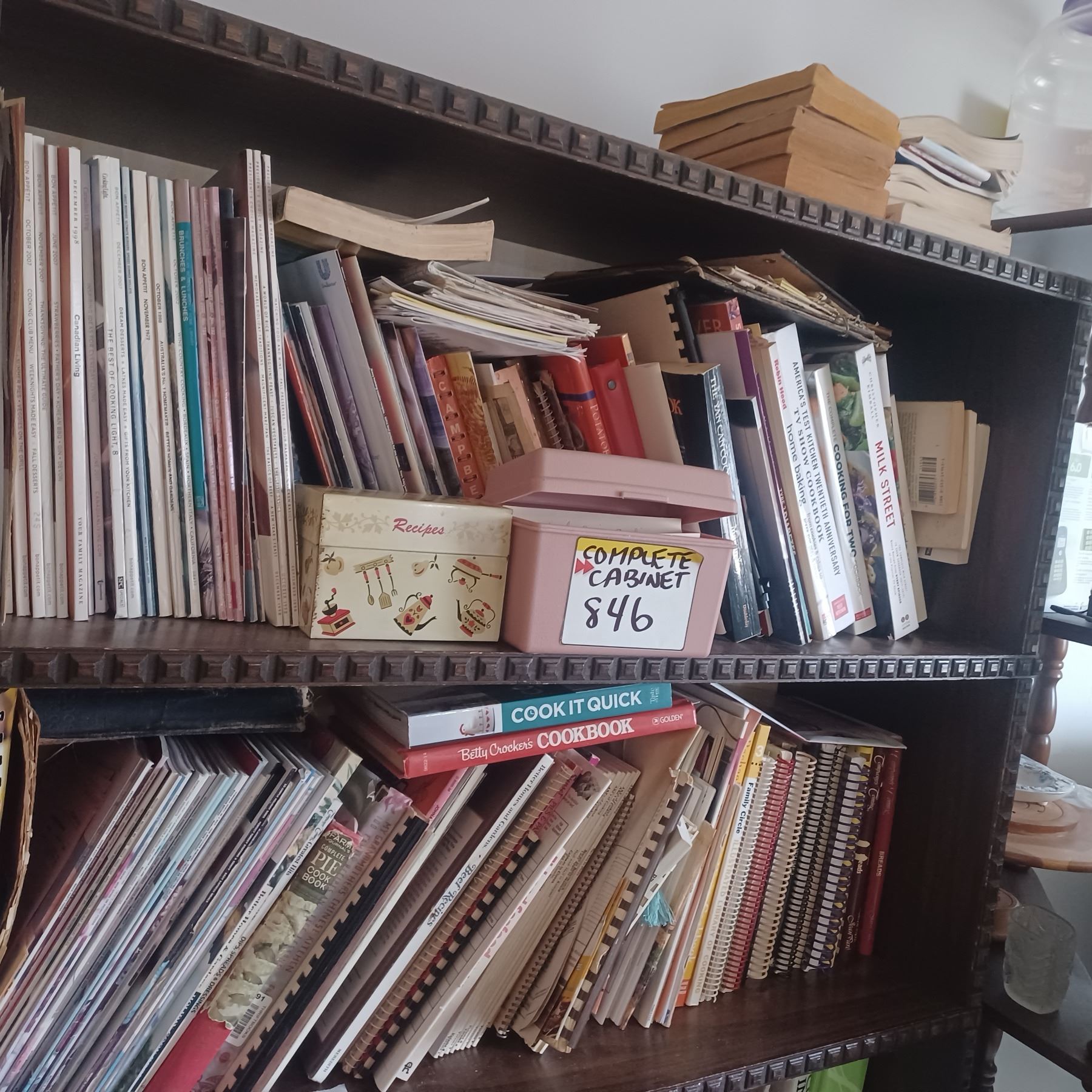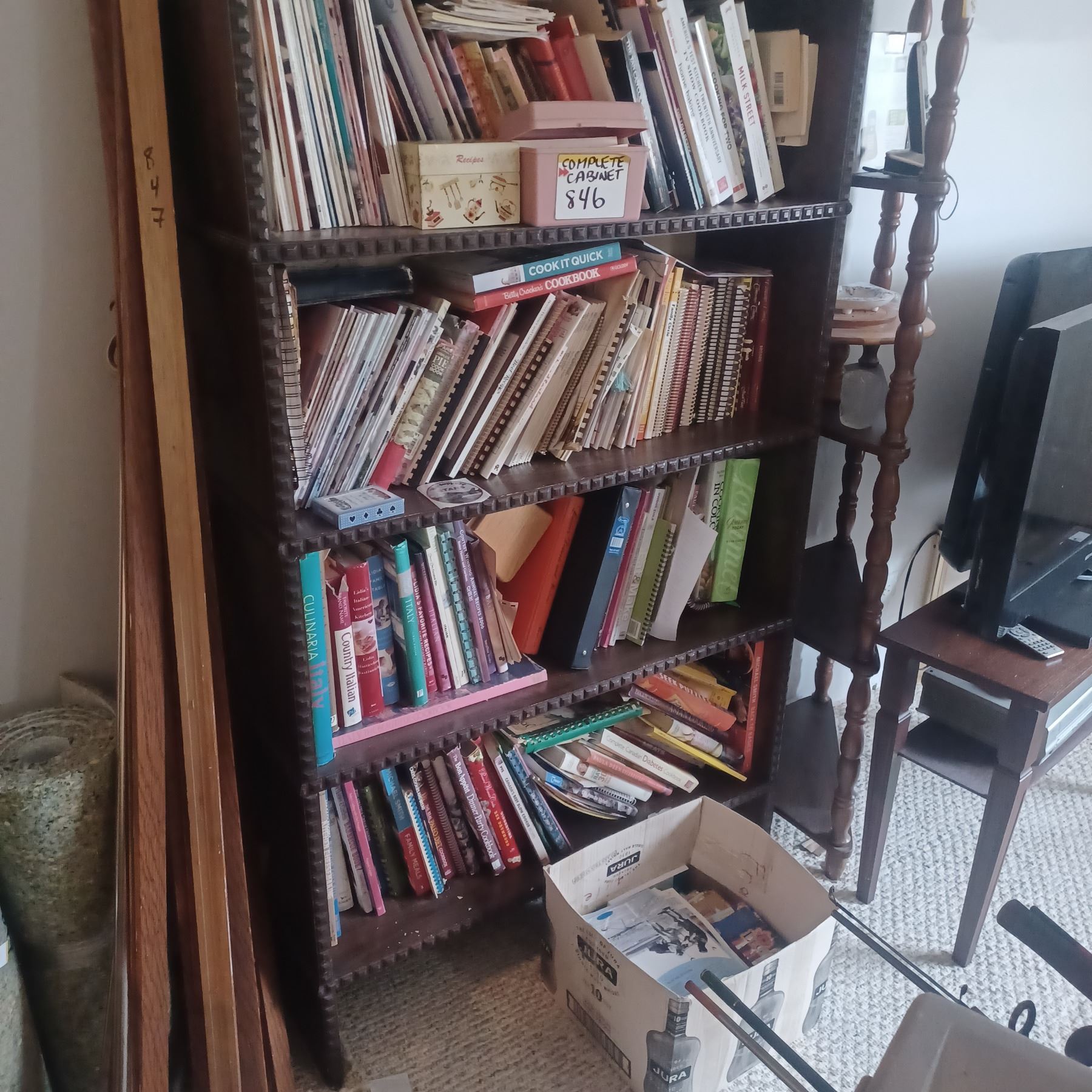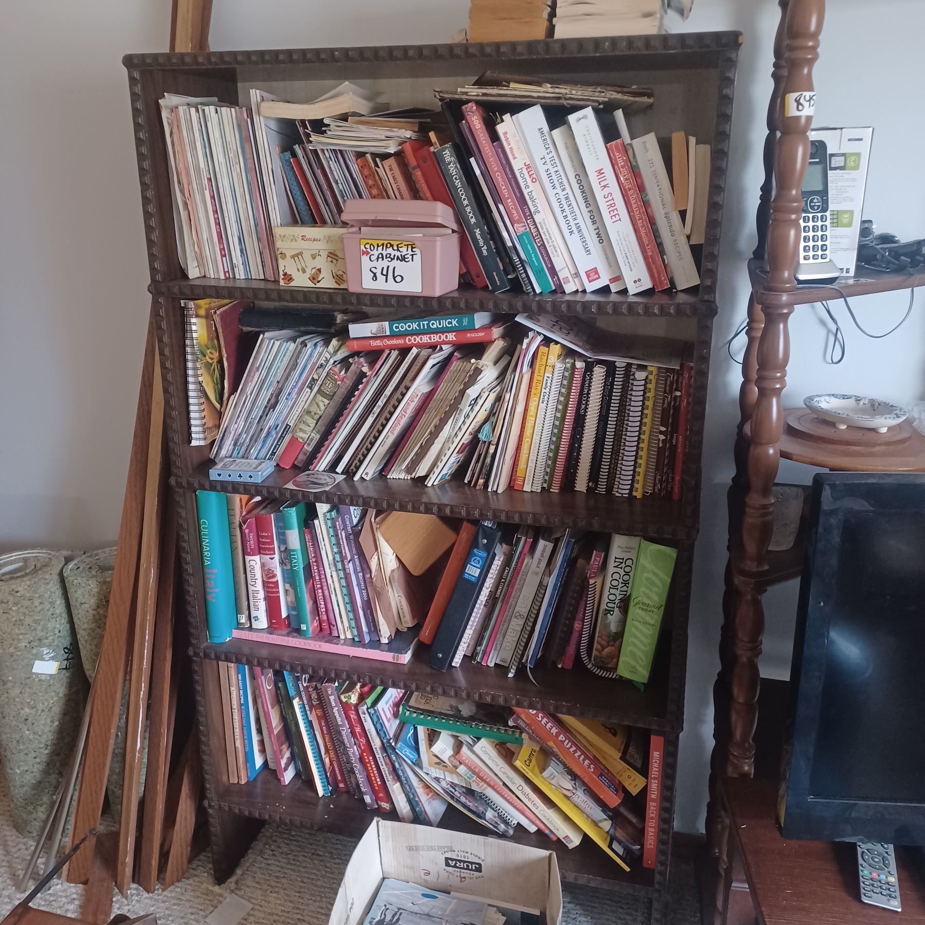 BOOK CASE C/W ALL CONTENTS AND BOX OF MISC MAGAZINE ON FLOOR