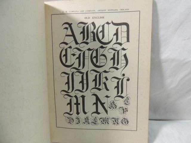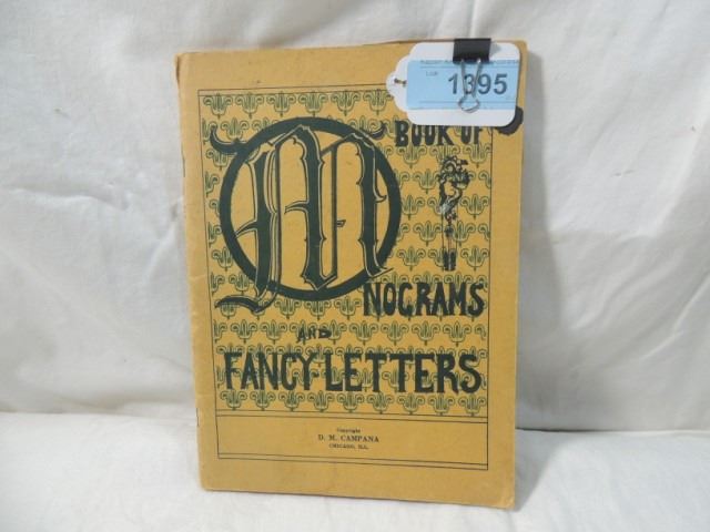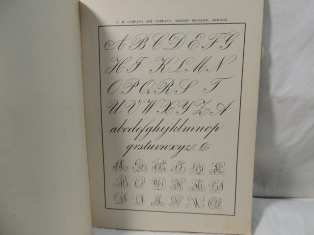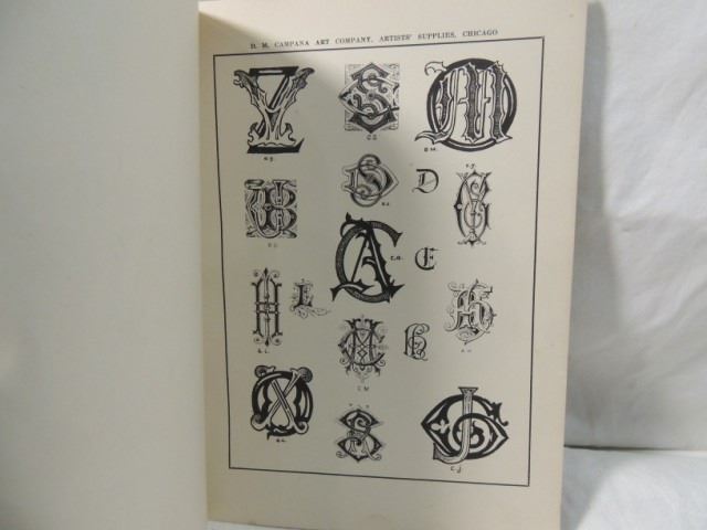 USED FOR CALLIGRAPHY AND SUCH FANCY LETTERING WITH HUNDREDS OF MONOGRAMS AND FANCY LETTERS AND NUMBERS TO USE. NICE VINTAGE BOOK. FIRST ISSUE. CHICAGO D. M. CAMPANA. AS SHOWN.