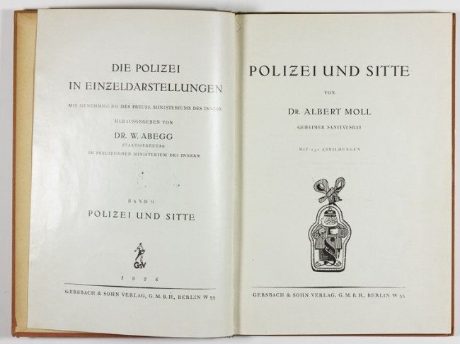 Book from the library of notorious SS-Gruppenfuhrer Reinhard Heydrich. This is a police-related volume: "Polizei und Sitte" ("Police and Morals"), by Dr. Albert Roll (Berlin: Gersbach & Sohn Verlag), 1926. 134pp. 8vo. in brown cloth and paper with gilt paper. The front paste-down bears Heydrich's 3 ?" x 4 ?" SS bookplate imprinted with his name at bottom. Fine. Probably one of the most ironic associations possible, here possibly the most immoral of Hitler's minions notes his ownership of an illustrated police-approved volume containing images from art and real life of prostitutes, transvestites, bordellos, pornography, child molesters, etc. and their effect on German society.