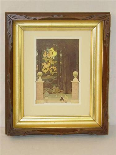 BOOK PLATE ILLUSTRATION BY MAXFIELD PARRISH OF CHILDREN ON STAIRS W/ CASTLE IN BACKGROUND - FROM POEMS OF CHILDHOOD BY EUGENE FIELD, IN A VICT. DEEP WALNUT FRAME;