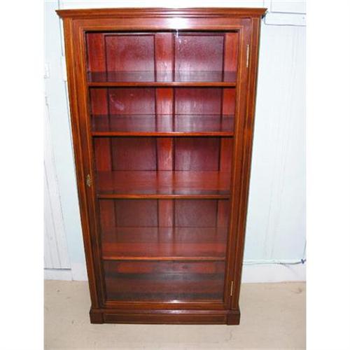 A FANTASTIC QUALITY INLAID SOLID MAHOGANY BOOKCASE IN A NICE SIZE. BEAUTIFUL GRAIN,FULL PANEL BACK AND 4 ADJUSTABLE SHELVES.THE FINISH & GLASS ARE ORIGINAL,SOLID BRASS HINGES,LOCK & KEY ESCUTCHEON.THE LOCK WORKS AND COMES WITH A KEY.