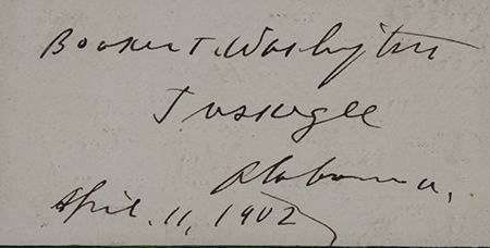 (1856-1915) Black American educator born a slave, established and headed Tuskegee Institute to provide practical training to blacks. Fine bold signature on a small card: "Booker T. Washington Tuskegee Alabama April 11, 1902". Matted with a portrait and set into a small gilt frame. Very good condtion, not examined out of frame.