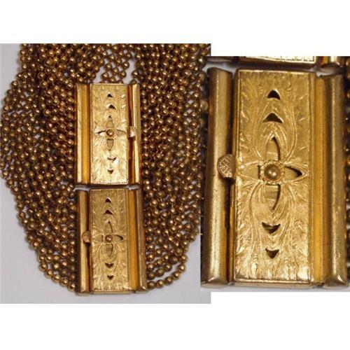 This is an antique demi parure of gilt ormolu with a wide fancy etched hidden clasp on both the bracelet and the necklace. This is heavy and well made and each one has 12 strands of gilt brass beads. The clasps are very Victorian and they are ORIGINAL to each other and to that time period. Just the size of these commands attention. Definitely fit for a queen. I have seen these in one or two of the antique jewelry books and they have a nice high tidy price on them. These are not just gilt brass, they have the rich color of the ormolu that makes them quite special. The necklace measures 15" long on the shortest strand with a FIVE inch drop . The bracelet measures 7" x 1 ¾" wide. These are for the high end collector and are great old period pieces. The 2nd and 3rd photo show two views of the same set. This is for one necklace and one bracelet.