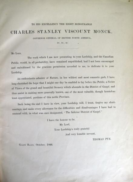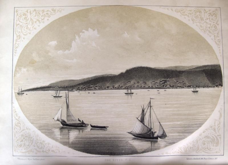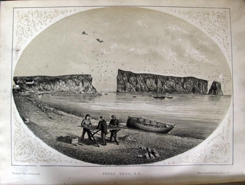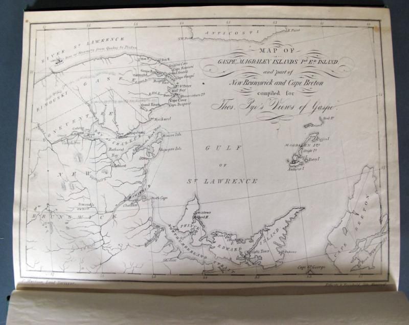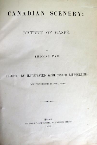 -Pye, Thomas. CANADIAN SCENERY: DISTRICT OF GASPE. Montreal: John Lovell, 1866. First Edition. Original cloth, rebacked. Beautifully illustrated with tinted lithographs, from photographs by the author. Full-page map + 19 full-page plates. All but one of the 19 plates are oval-shaped with ornamental corner pieces. Contents: [Plate 1:] "Perce Rock, C.E." [Plate 2:] "Fox River, C.E." [Plate 3:]"Grand Greve, C.E." [Plate 4:] "Gaspe Basin, C.E. Pl. 1" [Plate 5:] "GaspeBasin, C.E. Pl. 2" [Plate 6:] "Oil Well, Gaspe, C.E." [Plate 7:] "Point St.Peter, C.E." [Plate 8:] "Perce, C.E. Pl. 1" [Plate 9:] "Perce, C.E. Pl. 2"[Plate 10:] "Cape Cove, C.E." [Plate 11:] "Grand River, C.E." [Plate 12:]"Paspebiac, C.E. Pl. 1" [Plate 13:] "Robin & Co.'s Establishment" "Le Boutillier Bros Establishment" "Paspebiac, C.E. Pl. 2 & 3" [Plate 14:] "New Carlisle, C.E." [Plate 15:] "Carleton, C.E." [Plate 16:] "Dalhousie, N.B." [Plate 17:] "Bathurst, N.B." [Plate 18:] "Amherst Harbour, Magdalen Islands, C.E." [Plate 19:] "House Harbour, Magdalen Islands, C.E."