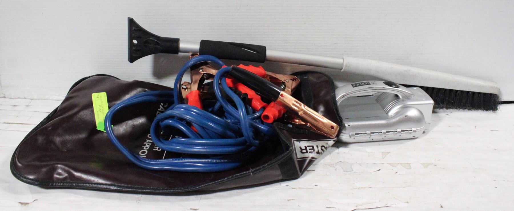 BOOSTER CABLES, FLASHLIGHT, SNOW BRUSH