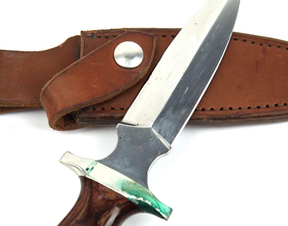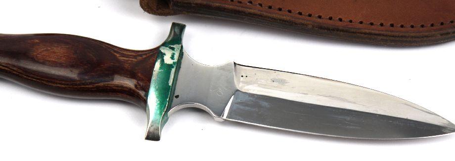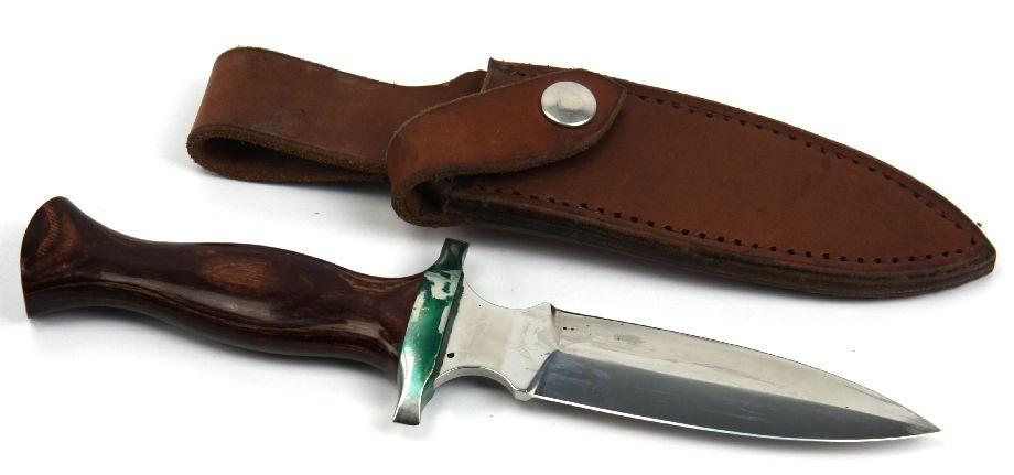 One boot knife manufactured by Track Knife, of Whitefish, Montana. 5 inch double edge blade, polished wood handle, and leather scabbard. Some discoloration to cross guard, due to contact with leather, otherwise excellent condition.