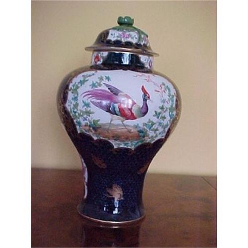 </font></strong>Very pretty cobalt blue covered vase hand decorated with birds of paradise in different poses to both the front and back panel. The vase is in good condition with only a small hairline approx. 1/2 inch on the inside of the neck at the top of the vase. The cover is also hand decorated and is in good condition with only a small chip to the outside rim edge. The vase was made by BOOTHS in England ca 1880, but is unmarked.</font>