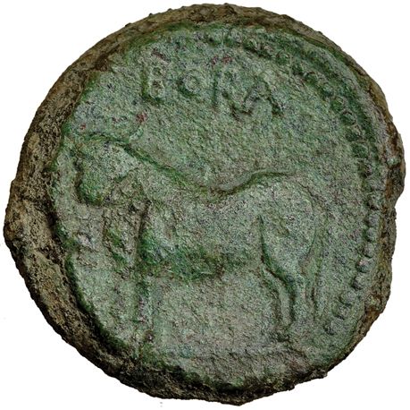 BORA, alcaudete (jaén). As. A/ Busto femenino velado a izq., delante cetro. R/ Toro a izq., encima ley.: BORA. AE 25,6 g. I-290. VILL-364/1. Pátina verde claro con tonos rojos. MBC+/MBC. Rara en esta conservación.
