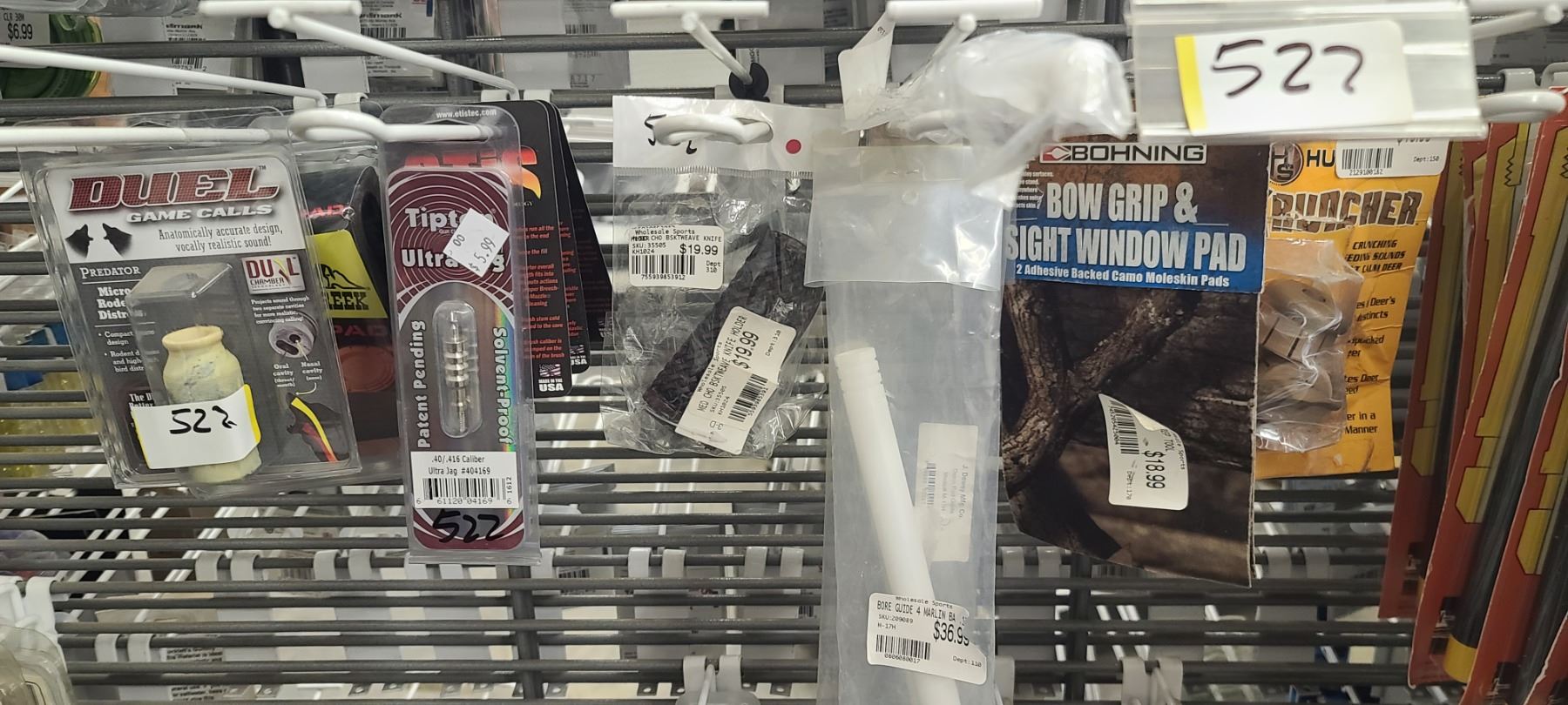 BORE GUIDE X 8, BOHNING MOLESKIN PADS X 2, KNIFE HOLDER,HS KRUNCHER DEERCALL, TIP TOP ULTRA JAG, BUTLER CREE RECOIL PAD $150
