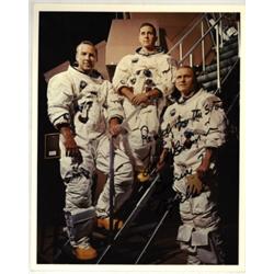 <b>1105. FRANK BORMAN</b> (b. 1928) American astronaut who served in the Gemini and Apollo programs. S.P. 8" x 10" color photo showing the crew of Apollo 8 standing on the stairs of the mission flight simulator, signed: "<i>Reach for the Stars! Frank Borman `Gemini 7' `Apollo 8'</i>". Fine.<b>$50-70</b>