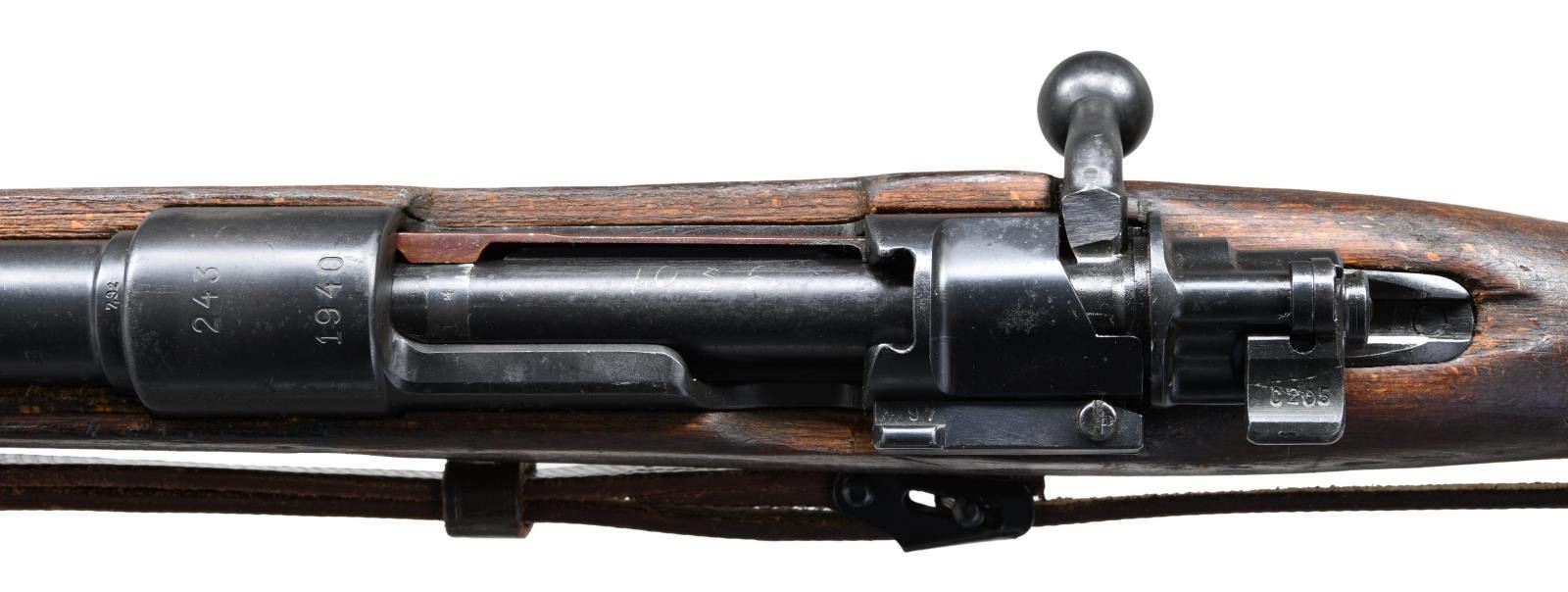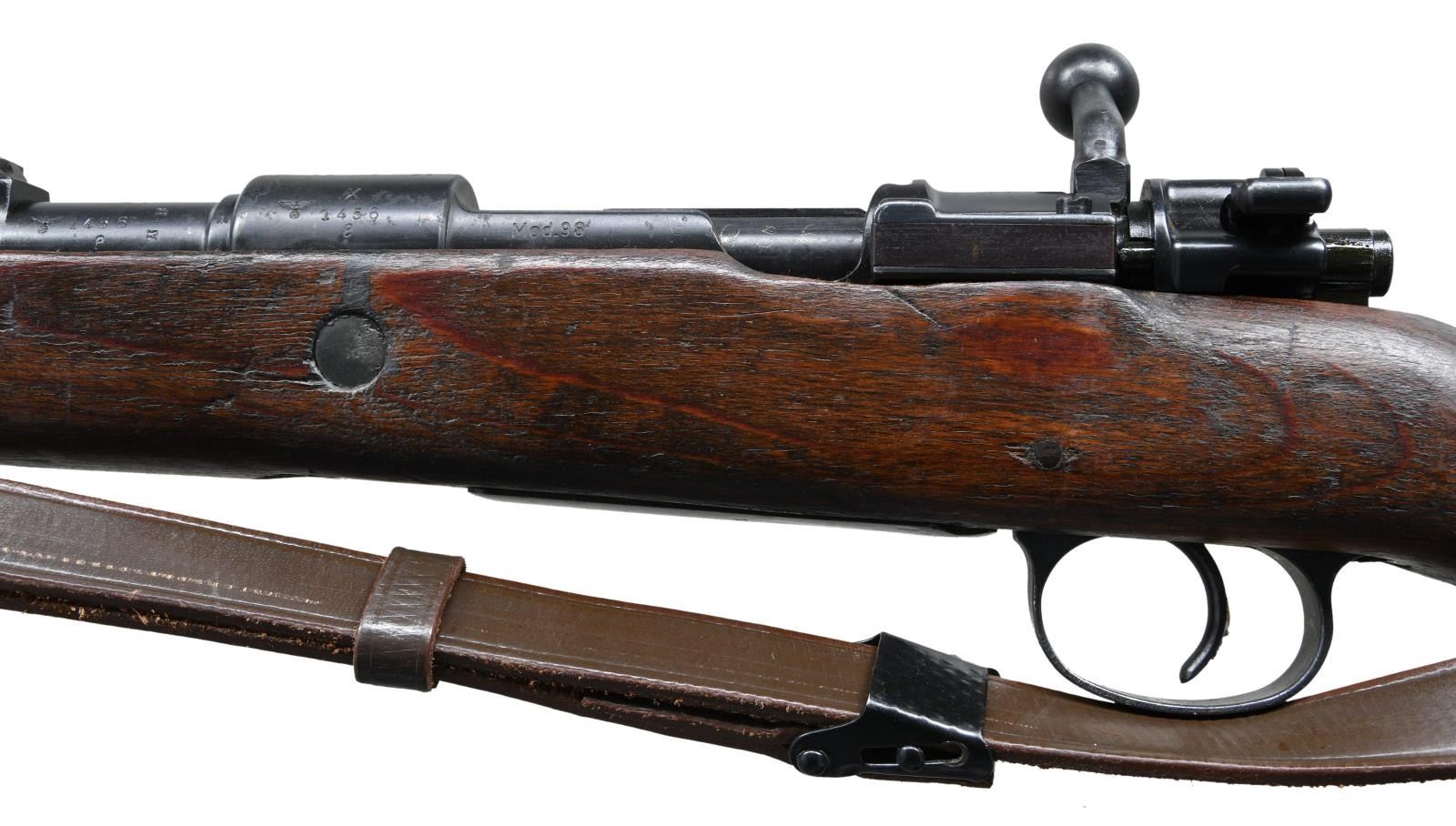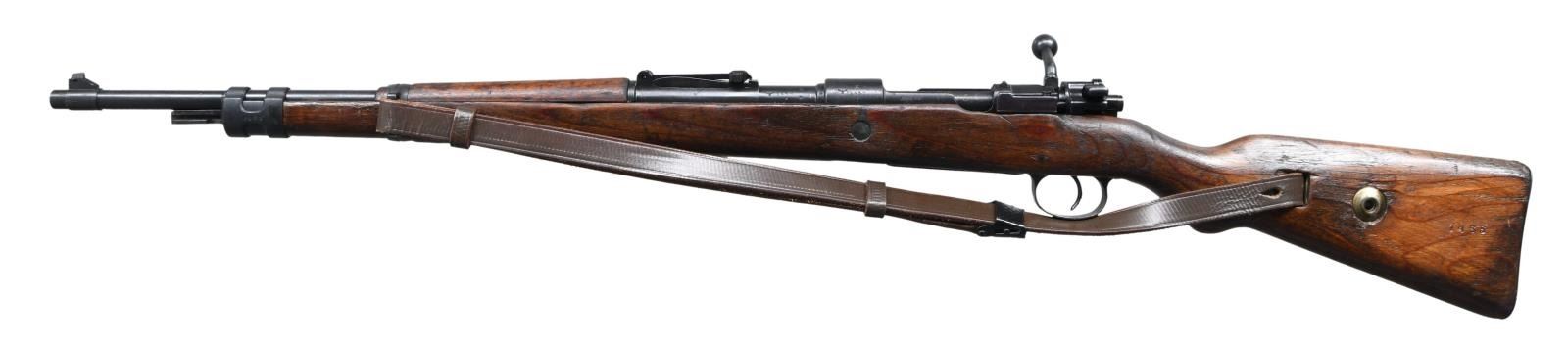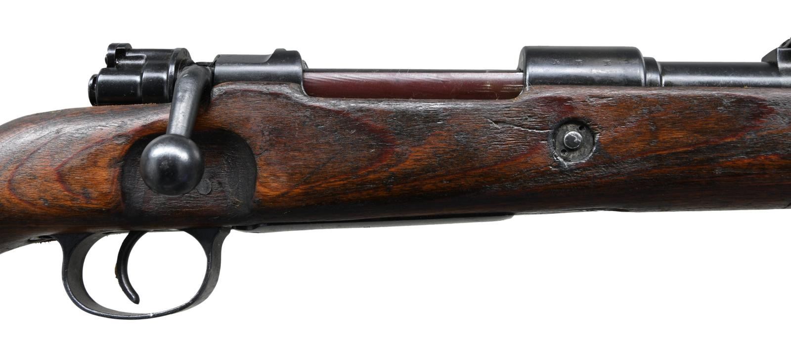 . Cal. 8mm Mauser. S# 1456e. Bbl. 23 1/2" w/ import marking. Matching numbers on bbl., front sight & left side of butt stock. Other parts mismatched. Russian capture & rework K98k rifle. Tangent rear sight graduated to 2000m. Blade front sight. Laminated stock w/ flat buttplate. Repro K98k style sling present. No cleaning rod present. CONDITION: arsenal reworked stock set has shellac w/ a couple delamination cracks, scattered dings & handling marks. Metal retains 90% arsenal rework blue w/ some dings on bottom metal, scattered light oxidation & silvering. Poor bore w/ scattered pitting. (23-1935/MJC). CURIO. $500-800.
