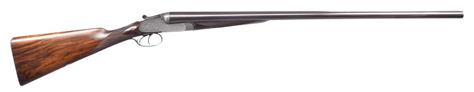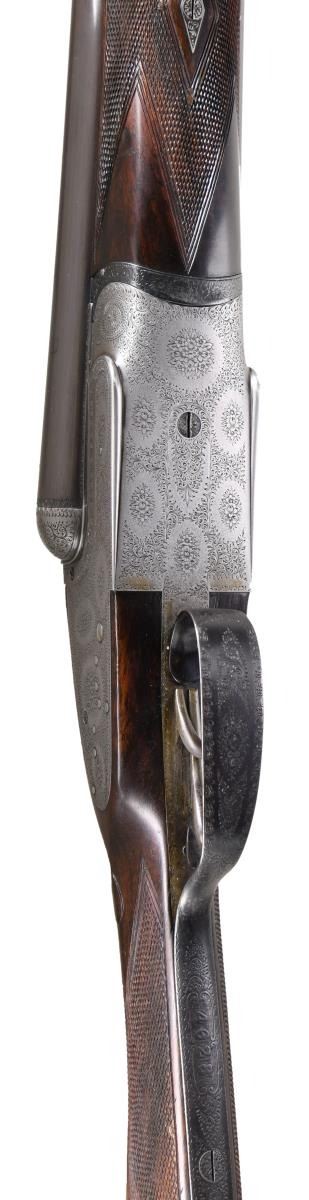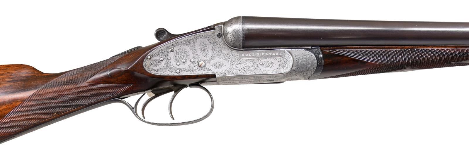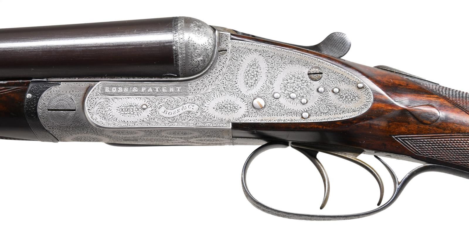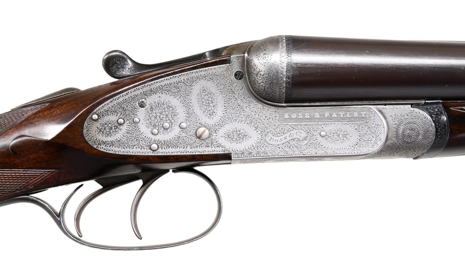 Caliber: 12 gauge, 2 3/4". Serial Number: 4628. Barrels: 30" chopper lump of fluid steel. Rib is marked "Boss & Co, 73, St James's street, London" .Water tables have BNP nitro proofs, 12-70, 850 BAR. Sidelock top lever action with bar type cocking indicators. Barrels, top lever and forearm iron are marked with gold number "2" indicating it is the second of a two gun set. Sides of frame are marked "BOSS'S PATENT". Action, trigger guard and forearm iron have full coverage fine rose and scroll hand engraving. Breech end of barrels has borderline engraving with scroll highlight on rib. Double triggers. Selective ejectors. Steel tipped splinter forearm and straight hand stock of fine English walnut having rich brown tones having vivid dark streaking. Features include tear drop points, hand checkering and brass oval nameplate in toeline. LOP: 14 7/16" to checkered butt. DAC: 1 9/16". DAH: 2 3/8". Stock has approximately 1/4" cast off. Bore diameter: R .726 L .726. Choke constriction: R .005 L .005. Minimum wall thickness: R .028 L .029. WEIGHT: 6 lbs, 10.2 oz. UNATTACHED ACCESSORIES: leather covered case with green cloth fitted interior. Inside lid has maker's label. Case contains 2 piece hardwood cleaning rod, ebony handled brush, ebony handled turn-screw, nickel finished oil bottle, 2 nickel finished snap caps, glass Rangoon Jelly bottle, assorted cleaning accessories & brushes. CONDITION: barrels retain over 97% blacked finish showing slight muzzle and edge wear with small scratches. Action has faded to an even gray appearance. Original wood finish shows light wear and marks with strong checkering. Action is tight and on face. Left ejector hammer does not hold in cocked position when gun is taken down. Very good bright bores. (24-1662/DS). CURIO. $15,000-20,000.