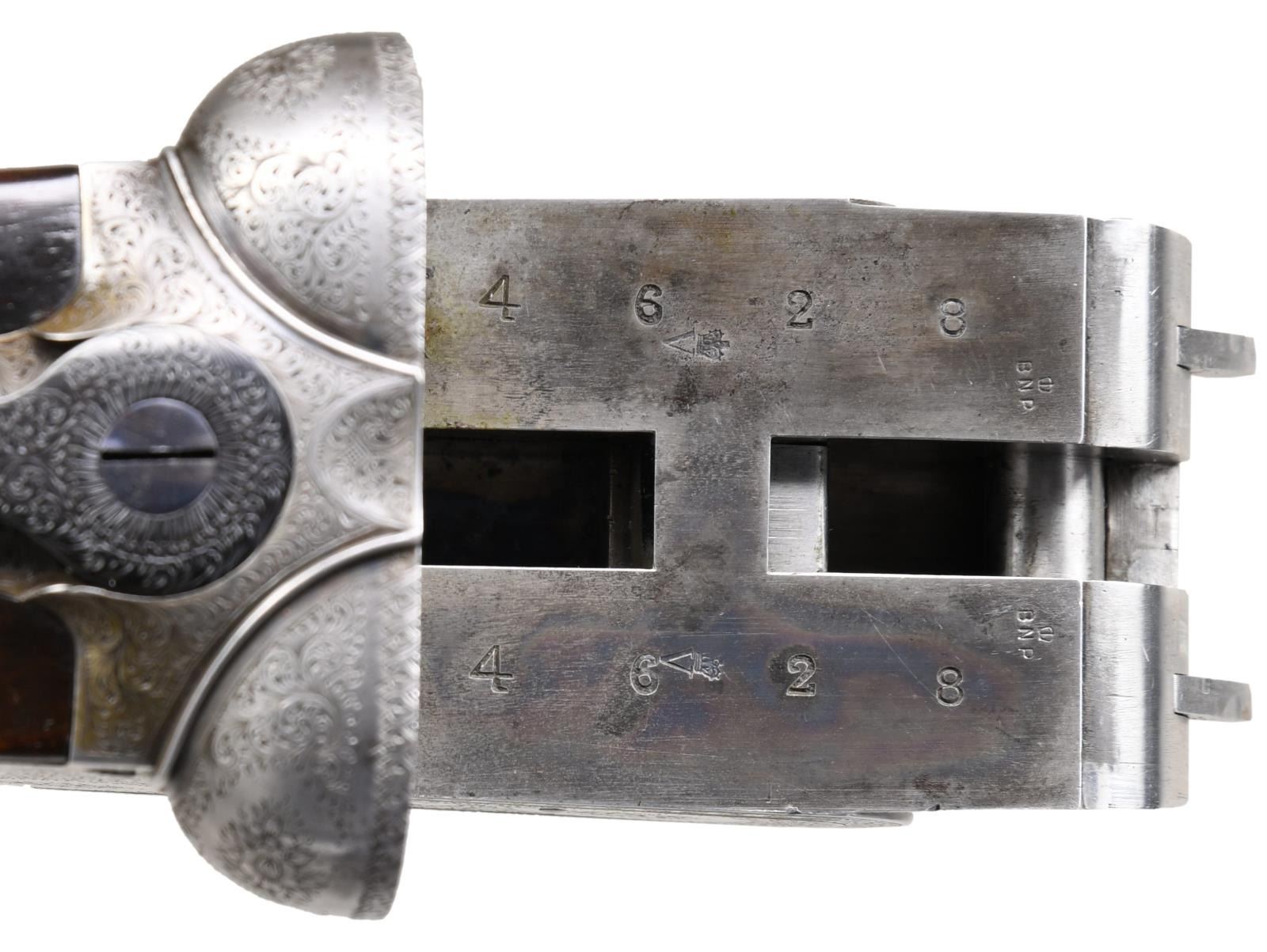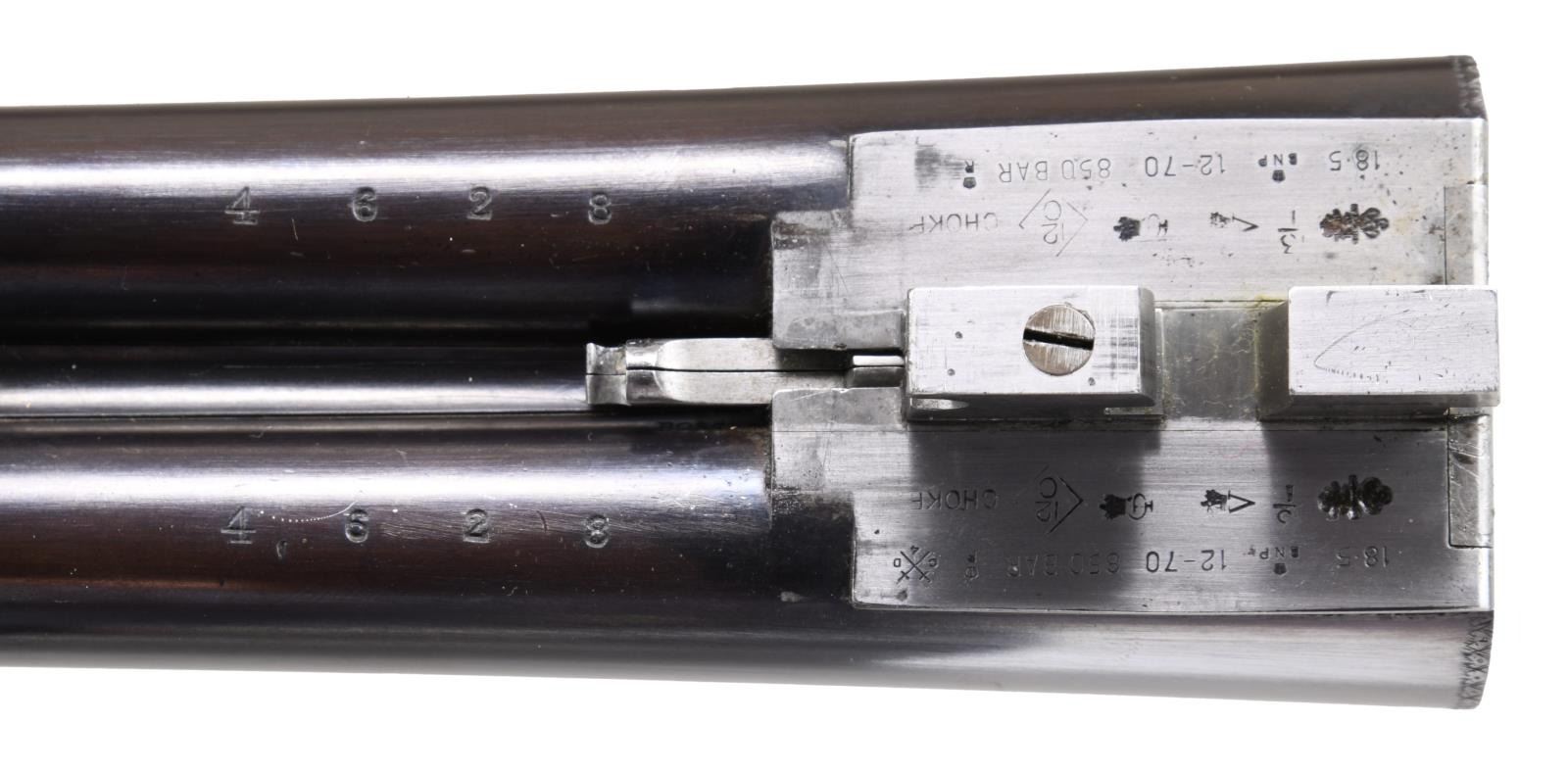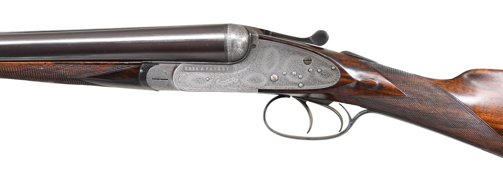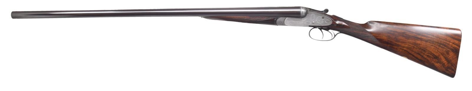 Caliber: 12 gauge, 2 3/4". Serial Number: 4628. Barrels: 30" chopper lump of fluid steel. Rib is marked "Boss & Co, 73, St James's street, London" .Water tables have BNP nitro proofs, 12-70, 850 BAR. Sidelock top lever action with bar type cocking indicators. Barrels, top lever and forearm iron are marked with gold number "2" indicating it is the second of a two gun set. Sides of frame are marked "BOSS'S PATENT". Action, trigger guard and forearm iron have full coverage fine rose and scroll hand engraving. Breech end of barrels has borderline engraving with scroll highlight on rib. Double triggers. Selective ejectors. Steel tipped splinter forearm and straight hand stock of fine English walnut having rich brown tones having vivid dark streaking. Features include tear drop points, hand checkering and brass oval nameplate in toeline. LOP: 14 7/16" to checkered butt. DAC: 1 9/16". DAH: 2 3/8". Stock has approximately 1/4" cast off. Bore diameter: R .726 L .726. Choke constriction: R .005 L .005. Minimum wall thickness: R .028 L .029. WEIGHT: 6 lbs, 10.2 oz. UNATTACHED ACCESSORIES: leather covered case with green cloth fitted interior. Inside lid has maker's label. Case contains 2 piece hardwood cleaning rod, ebony handled brush, ebony handled turn-screw, nickel finished oil bottle, 2 nickel finished snap caps, glass Rangoon Jelly bottle, assorted cleaning accessories & brushes. CONDITION: barrels retain over 97% blacked finish showing slight muzzle and edge wear with small scratches. Action has faded to an even gray appearance. Original wood finish shows light wear and marks with strong checkering. Action is tight and on face. Left ejector hammer does not hold in cocked position when gun is taken down. Very good bright bores. (24-1662/DS). CURIO. $15,000-20,000.
