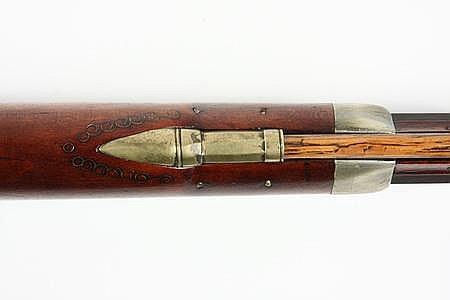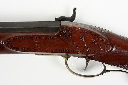BOSTON LONG RIFLE - Boston Long Rifle by Lane & Reed, marked on the lockplate, with 41IN octagonal barrel, walnut stock with concave sides under barrel, brass fittings including shaped and engraved patch box in butt, shaped brass cheekplate, checked grip, shaped longtail brass trigger guard, inset brass wire scrollwork in stock, 56 3/4IN long overall.