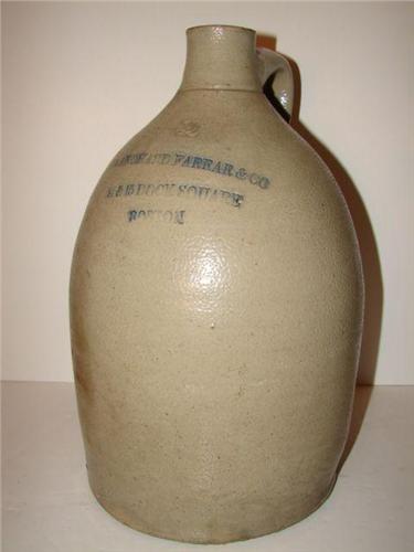 BOSTON STONEWARE JUG. 2 gallons. Stamped text reads “Blanchard Farrar & Co./14 & 15 Dock Square/Boston”. Shows major cracking and crude repair at bottom of body and at base. 14” H