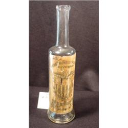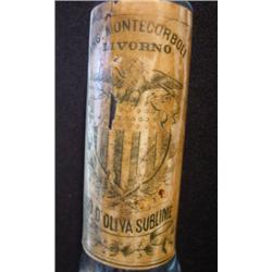 9 1/4" by 2 1/2" diameter with 3" long neck. Bottle Ang. LO Montecorboli Livorno, paper label with eagle and shield, "Olio D'Oliva Sublime". Label is clear glass.