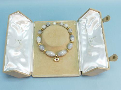 BOUCHERON, FRANCE - An important 18 kt. gold, diamond and carved agate necklace. Large polished agate beads with gold spacers, central heart shaped pendant mounted with pave set diamonds, a cabochon ruby and sapphire. In silk and suede presentation case. Fully signed and marked.