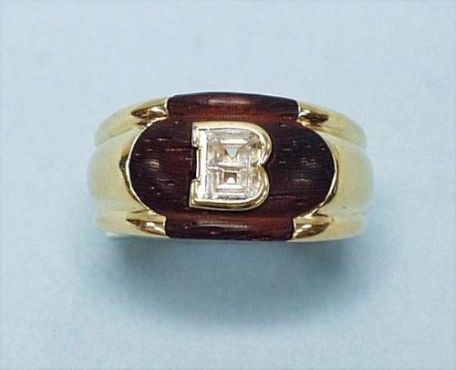 BOUCHERON, FRANCE - An unusual 18 kt. yellow gold and diamond band ring mounted with a boxwood inset surrounding a single rectangular cut diamond in a "B' shape collet setting. Fully marked. 7000-8000