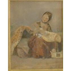 BOULANGER, Elisa. "Feeding Time". Aquarelle, signée. École française 19e S. Watercolour, signed. 19th C. French School. 5 1/2" - 4 1/2" - 14cm x 11.5cm. $300/400