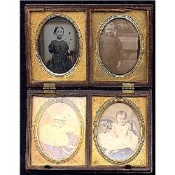 Here we begin the flower and fruit motifs. This is a double-1/9 plate size case, with 2 compartments on each side. All have oval mats. One has a nice ambrotype of a girl, the others paper images. The brown case seems without a flaw.