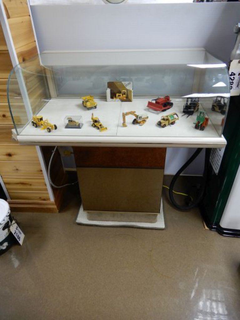 BOW FRONT LIGHT UP DISPLAY CABINET ON PEDASTAL MIRRORED BASES - STORAGE BELOW - 36" X 23 3/4" X 40" - WITH CONTENTS OF CONSTRUCTION TOYS 4 DINKY TOYS, 2 ERTL 2 MASCOT - JOHN DEERE DOZER LOCATION: LOWER BACKROOM