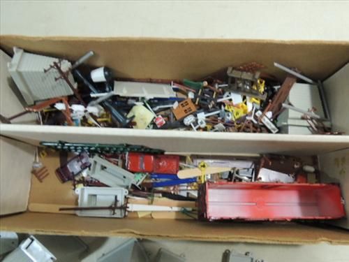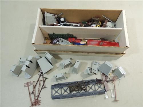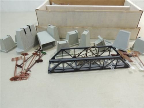 BOW LOT ASSORTED HO SCALE TRAIN BRIDGE, TRESSELS, TELEPHONE POLES, MISCELLANEOUS PIECES. AS SHOWN. VIEW PICTURE FOR DETAIL.