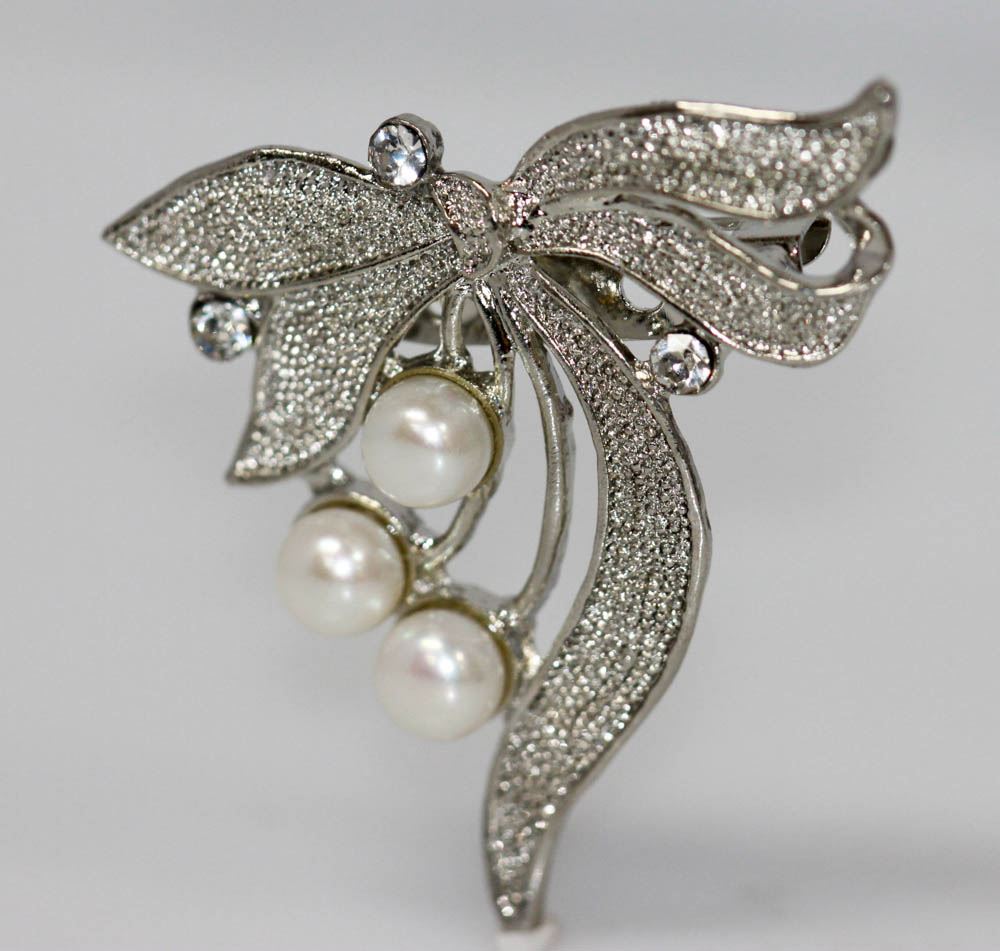 BOW STYLE WHITE PEARL CZ BROOCH .925 STERLING SILVER **|**|** WHITE PEARL CZ BROOCH AUTHENTIC PHILIPPINE PEARL METAL .925 STERLING SILVER