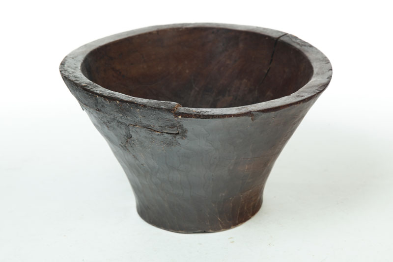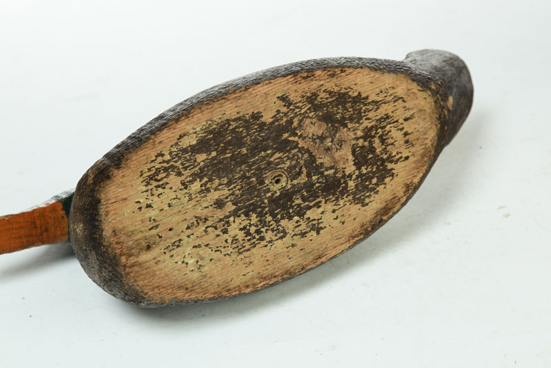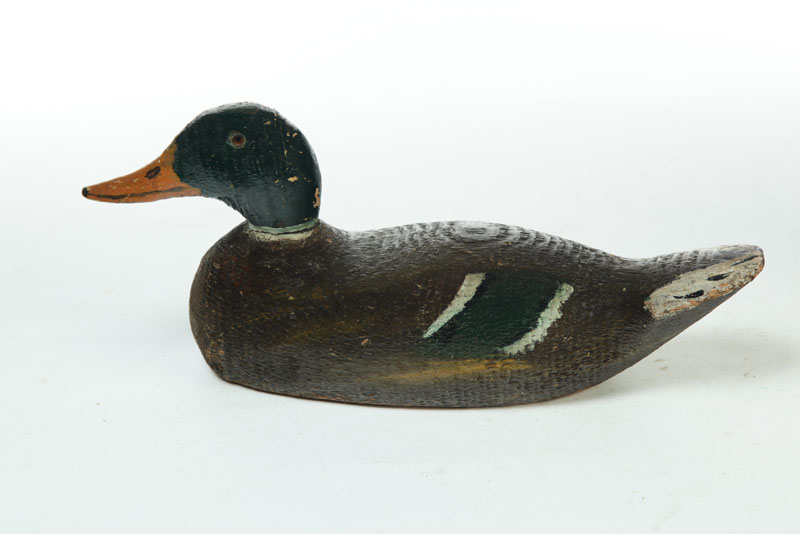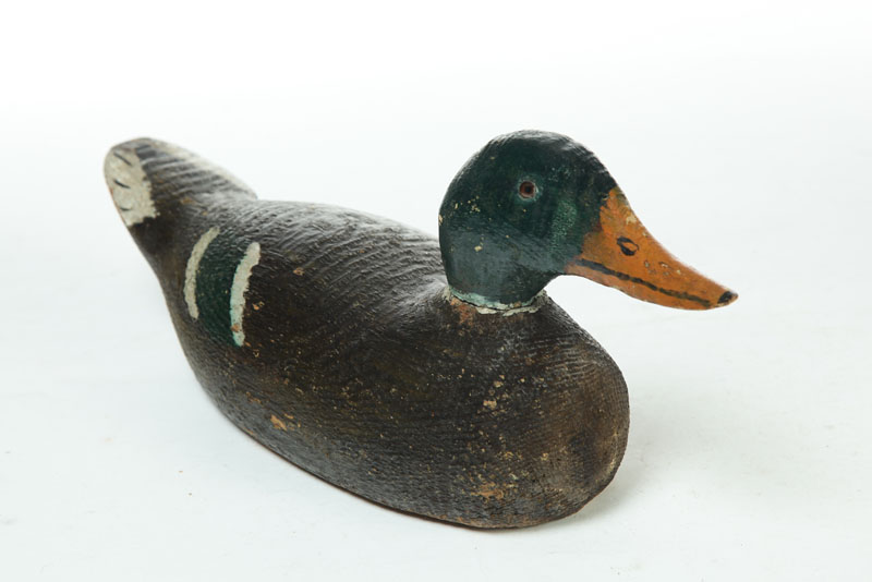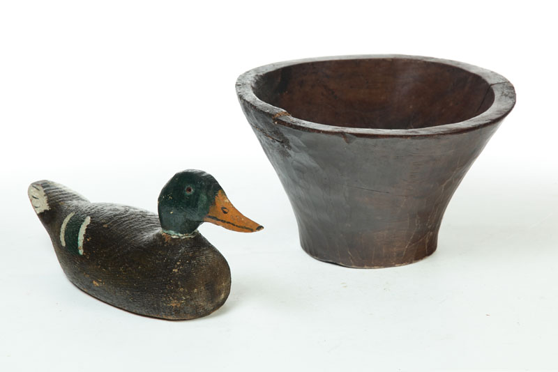 American, 19th-20th century. Carved wooden bowl with tapered form, probably a mortar. Age splits. 8"h. 14"d. And a mallard drake decoy. Some inpainting, 7"h.